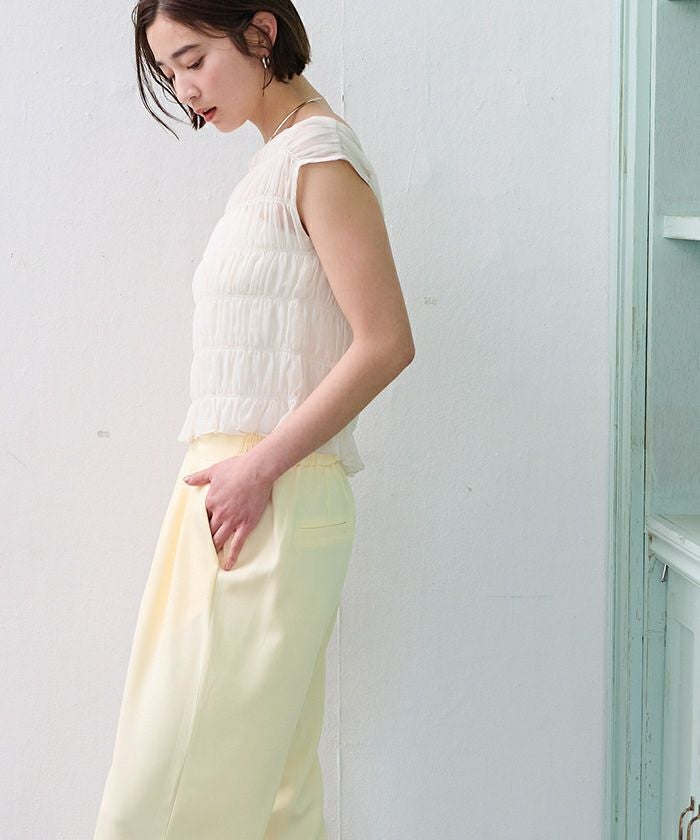 ウエストはゴム仕様で、リラックス感がありながらもきちんと見えするのがポイント。
