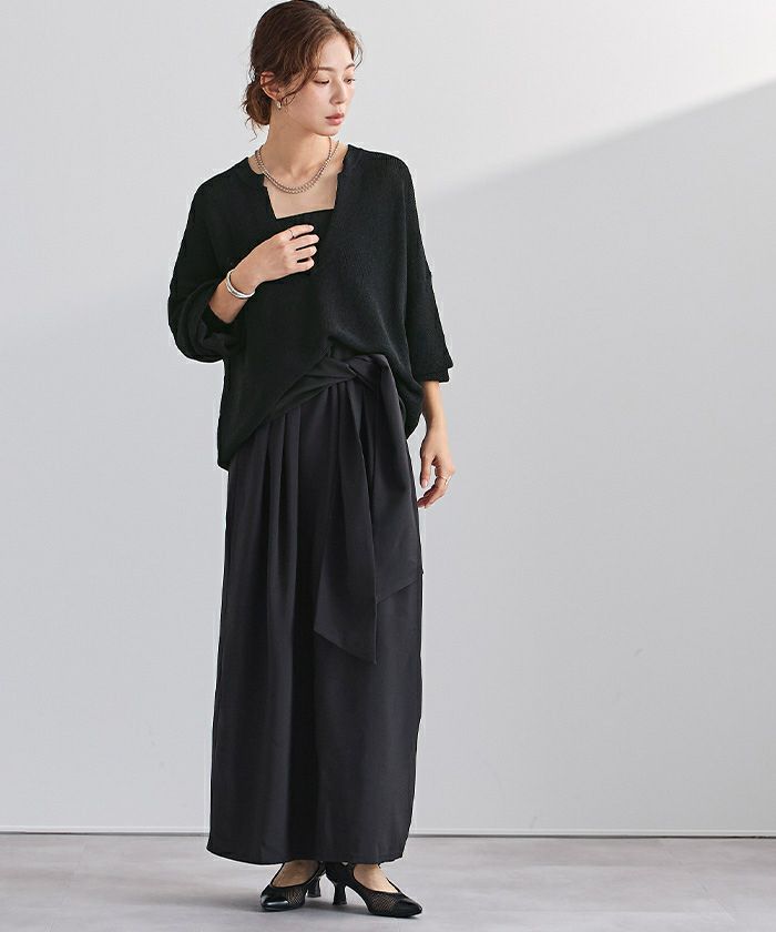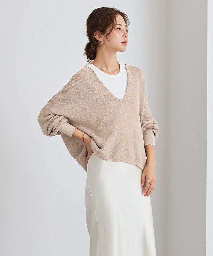 深めのネックデザインが顔まわりをすっきり見せ、シンプルながらも大人のこなれた印象をプラス。