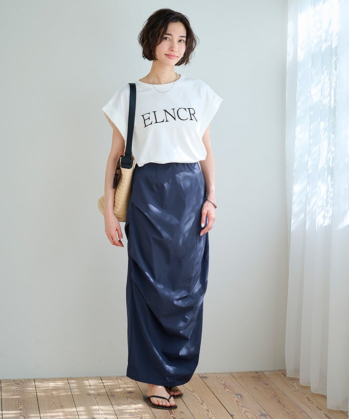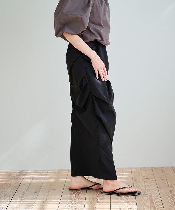 ウエストは総ゴムで楽な履き心地ながら、落ち感のある素材でスマートに見せてくれる一枚です。