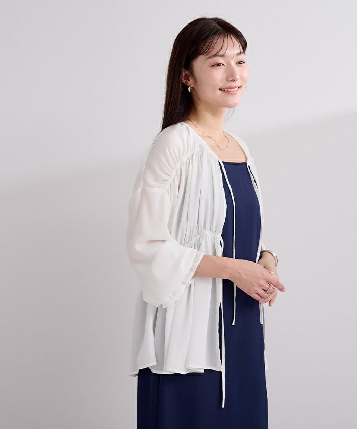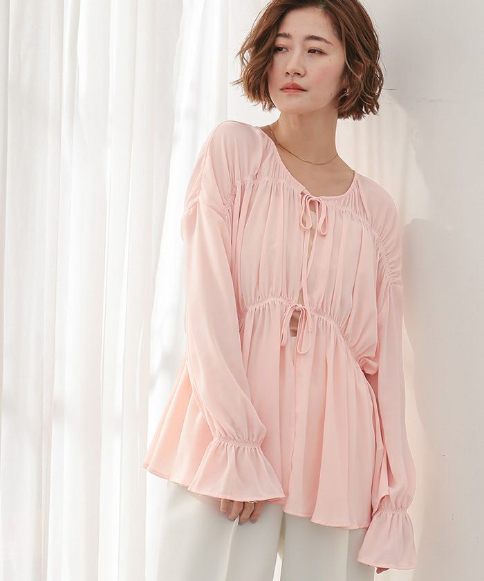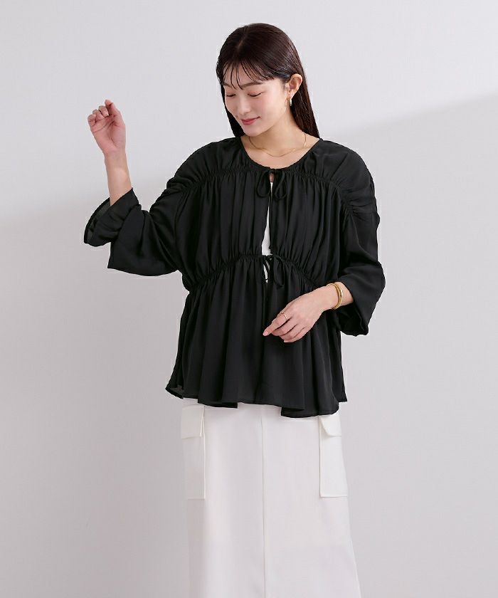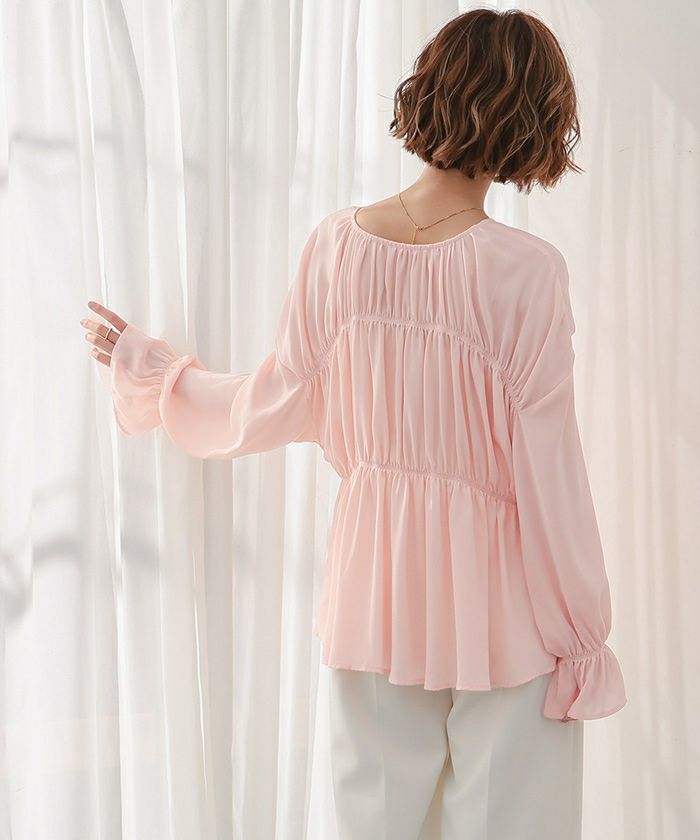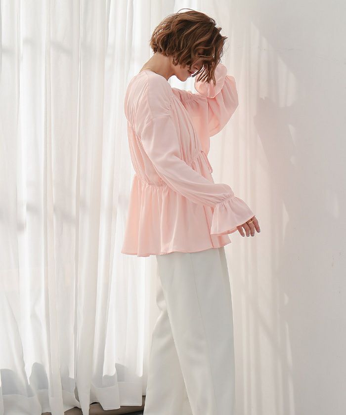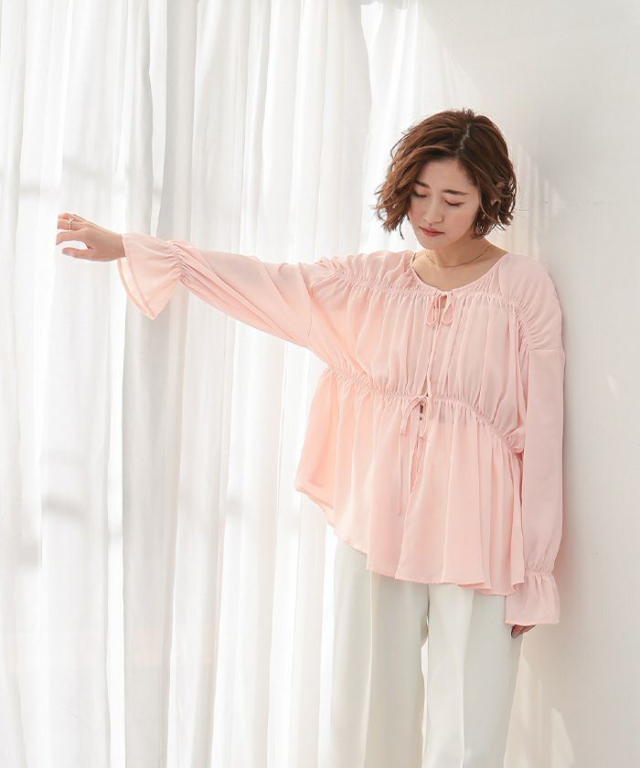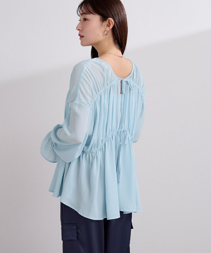 ギャザーをたっぷりと寄せた、ふんわりとしたシルエットのシアーブラウス。