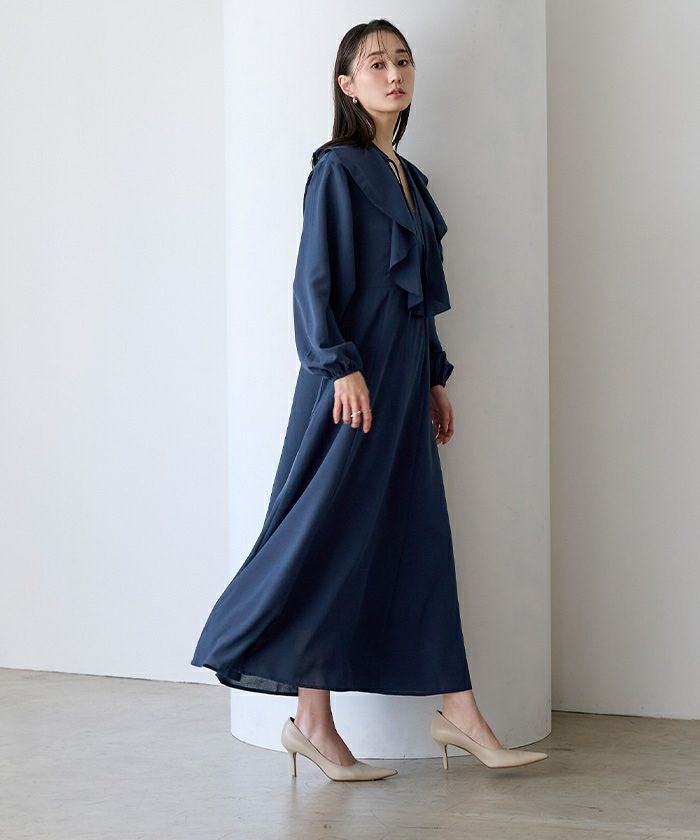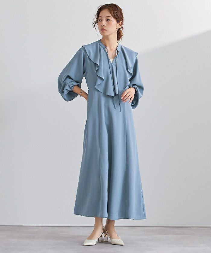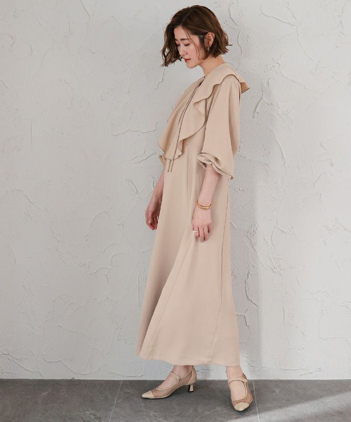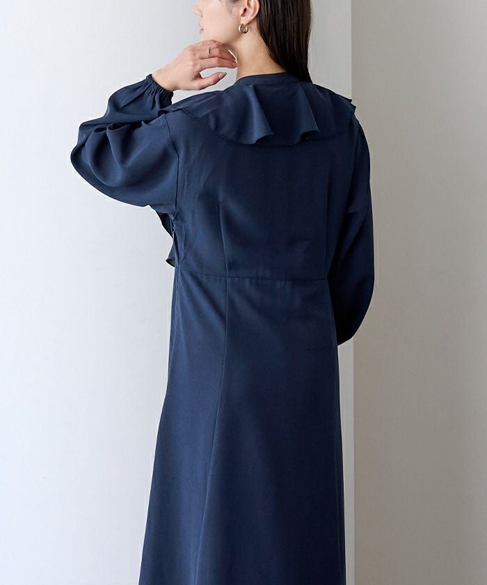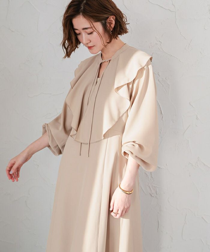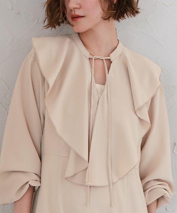 胸元のフリルが上品な華やかさを演出し、顔まわりを優しく見せてくれます。