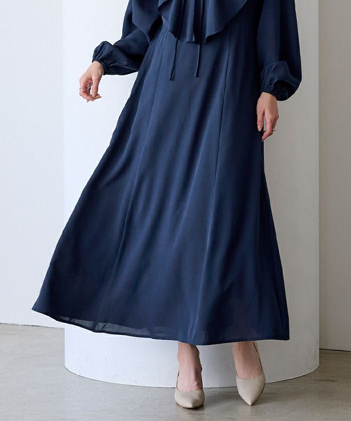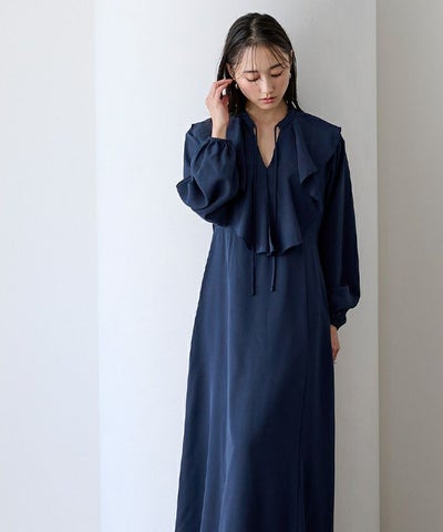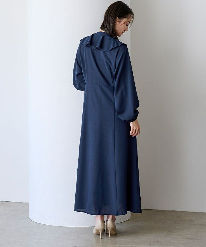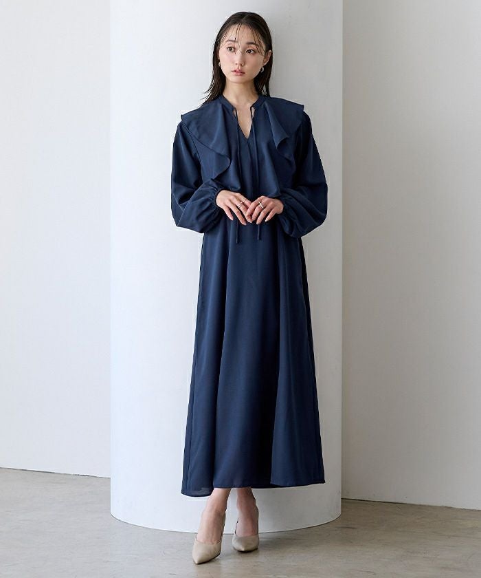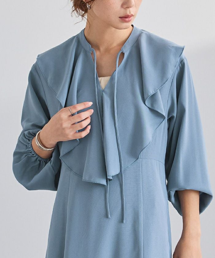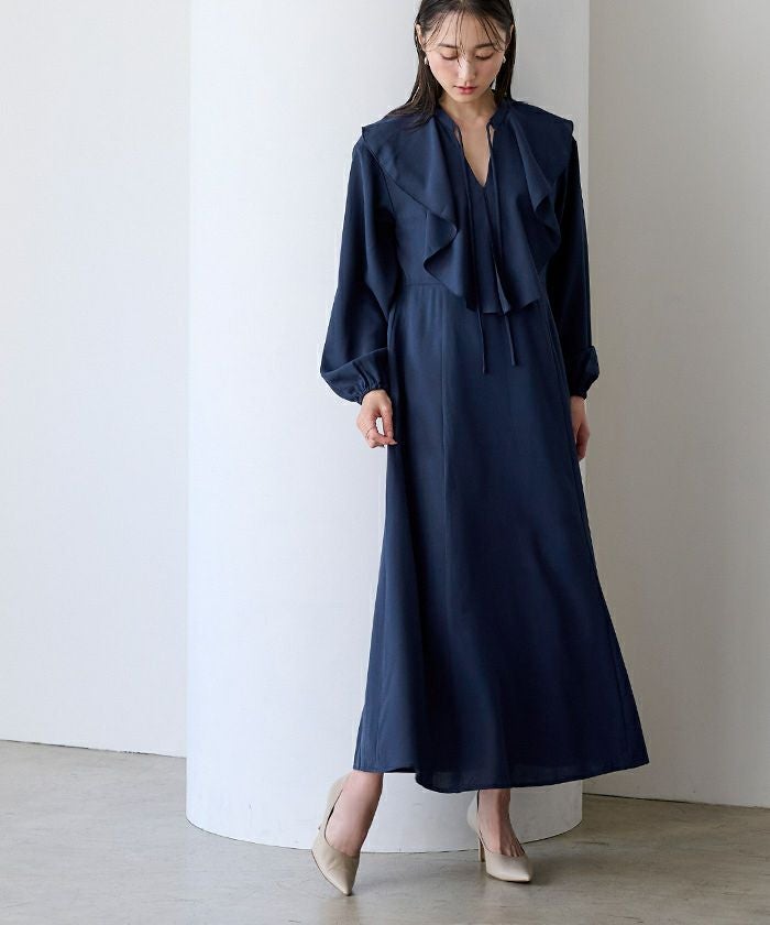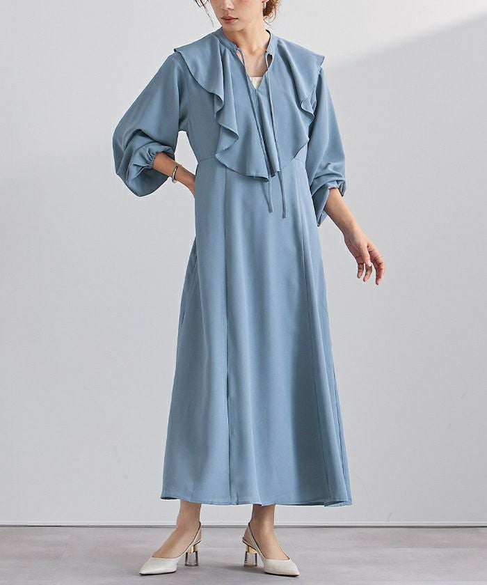 胸元のフリルが上品な華やかさを演出し、顔まわりを優しく見せてくれます。