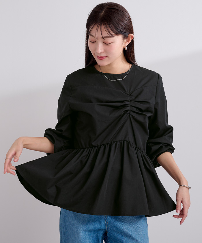 フロントの立体的なデザインが目を惹くペプラムブラウス。