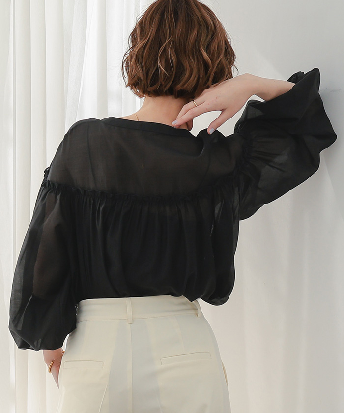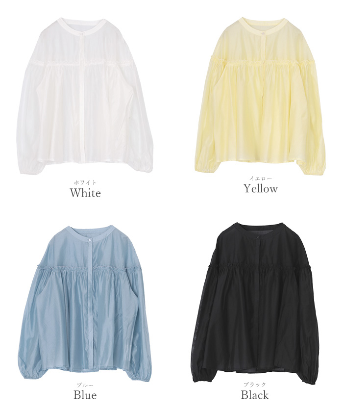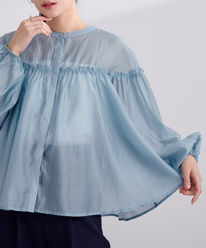 ヨーク切り替え部分にたっぷりとギャザーを寄せることで、ふんわりとしたシルエットを生み出し、女性らしさを演出します。ゆったりとしたサイズ感で羽織りとしても着用でき、幅広いスタイリングに活躍する一枚です。