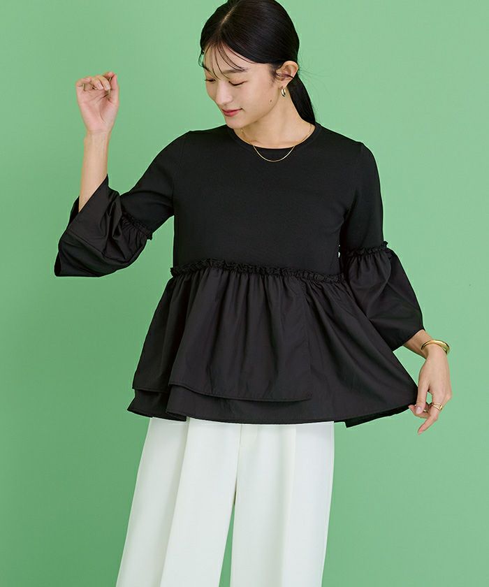 袖と裾にはハリのある布帛素材をドッキングし、立体感のあるシルエットに仕上げました。