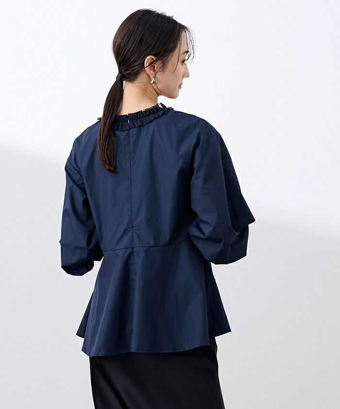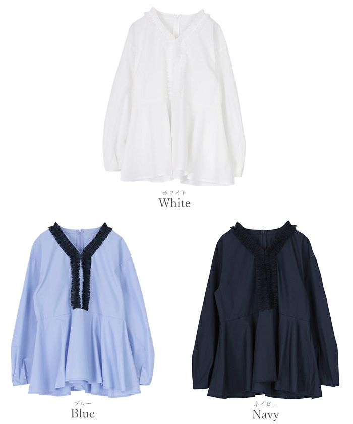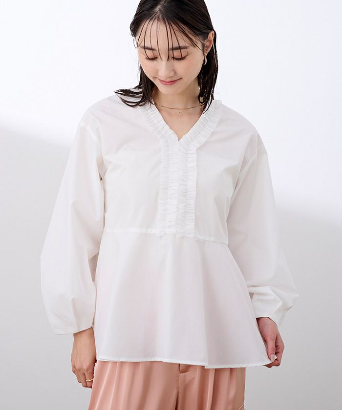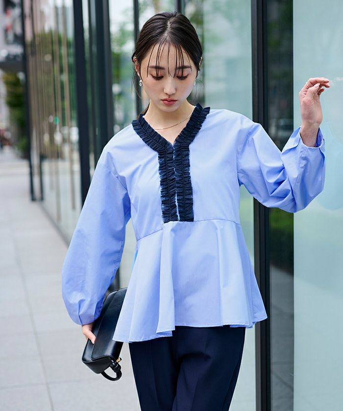トレンドのチュールフリルをVラインに施したデザインブラウス。