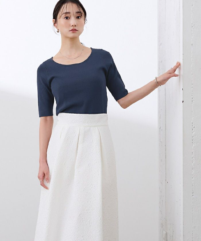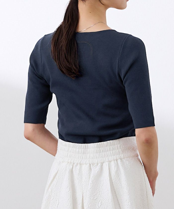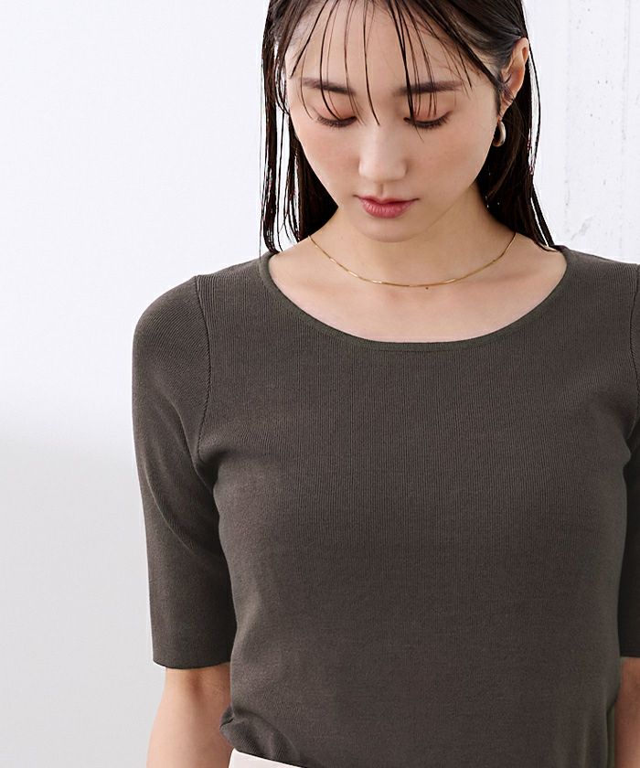 ベーシックに使えるラウンドネックのハーフスリーブニット。