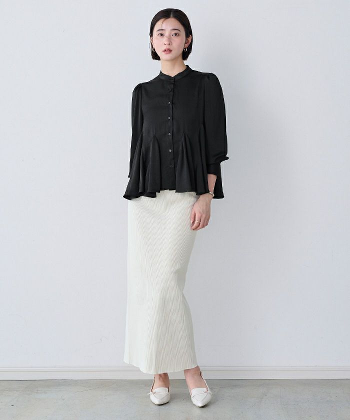 生地の落ち感を生かした裾のフレアが、動くたびに女性らしい華やかさを演出します。