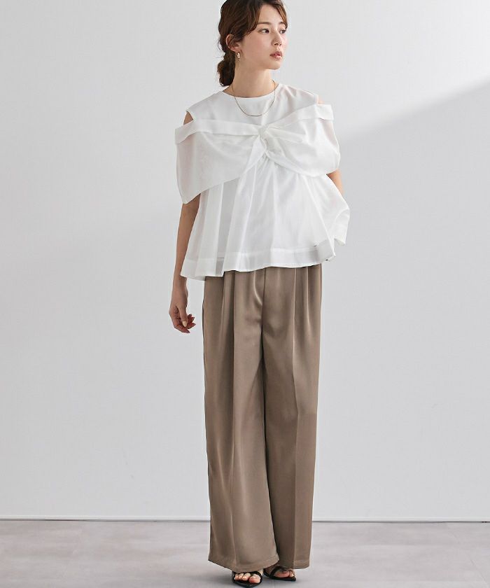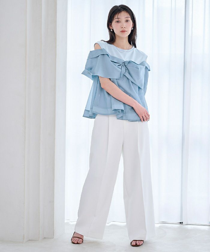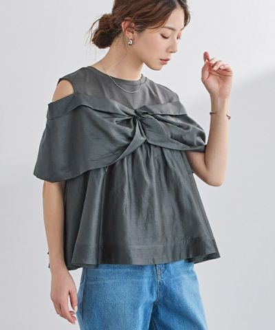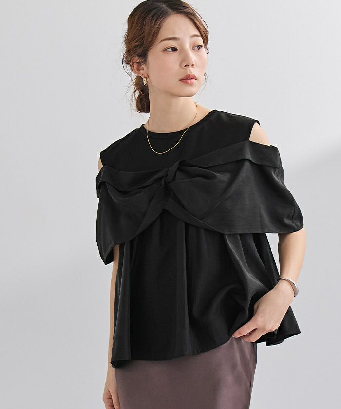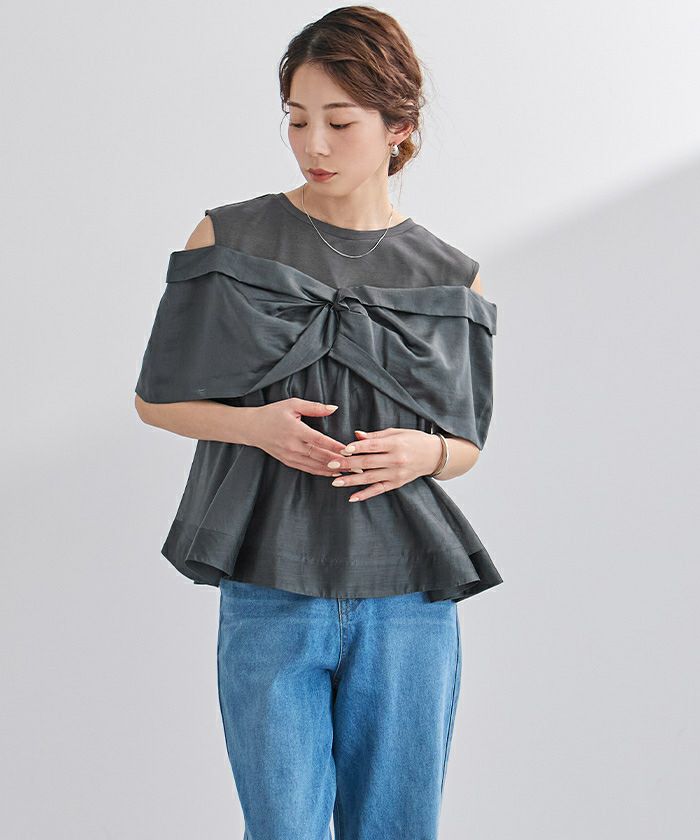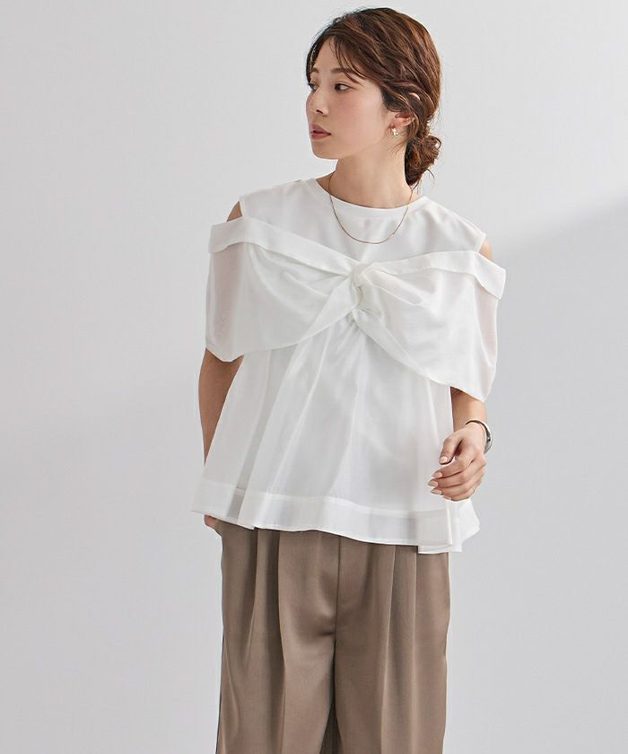 フロントのノットデザインが目を惹く、存在感のあるトップス。