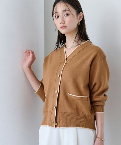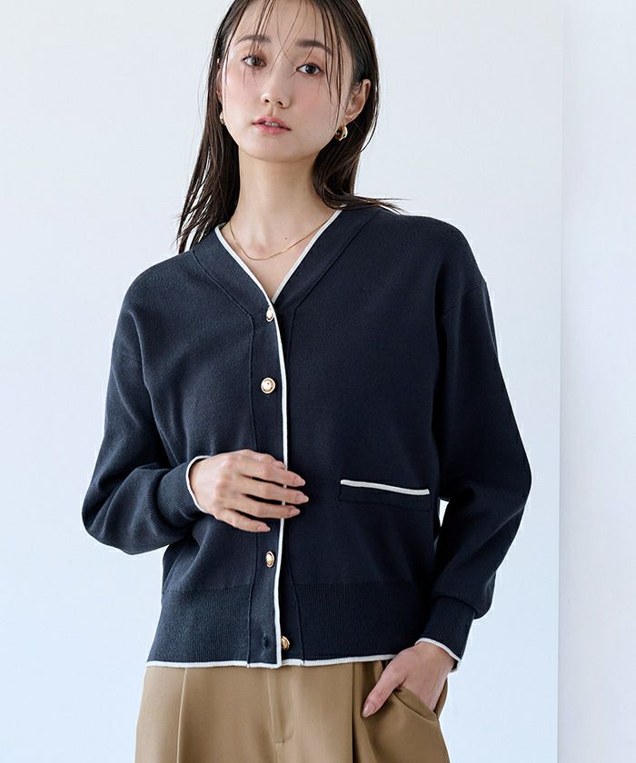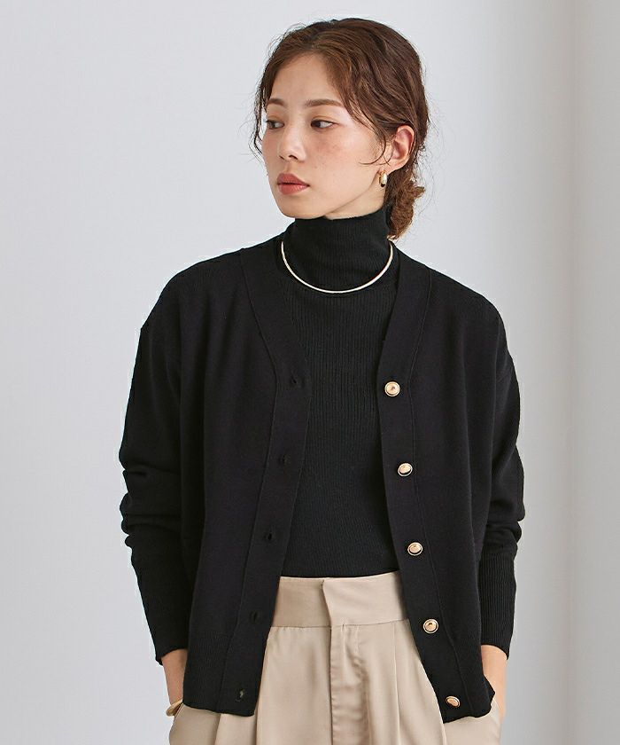 ゴールドボタンが映えるVネックカーディガン。