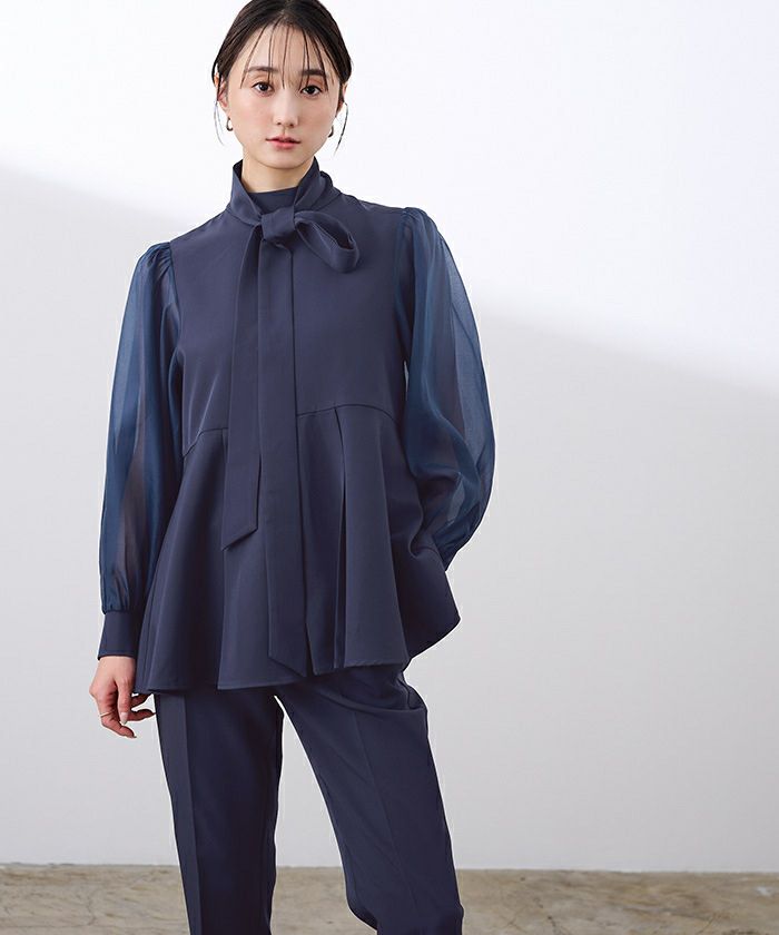 上品な華やかさを添えるボウタイデザインと、上品に透けるシアースリーブがポイントのセレモニーセットアップ。