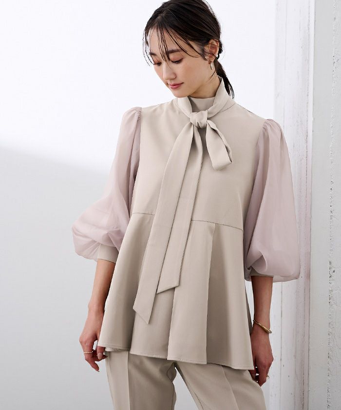 トップスは軽やかなシフォン袖が女性らしさを引き立て、肩まわりを優しく覆うため、露出を控えたい場面でも安心。