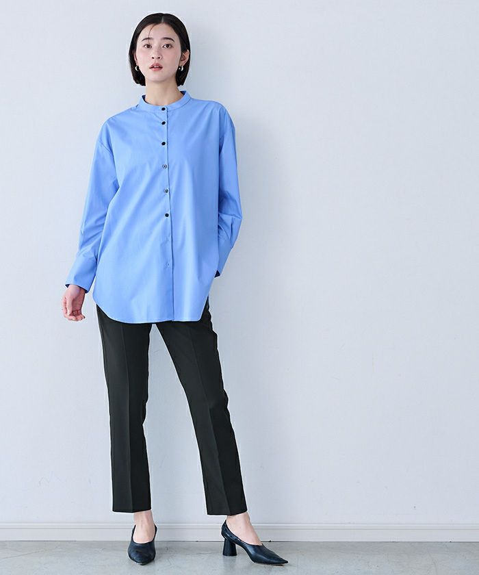 テーパードパンツはすっきりとしたラインながら、後ろゴム仕様で動きやすさときちんと感を両立しています。