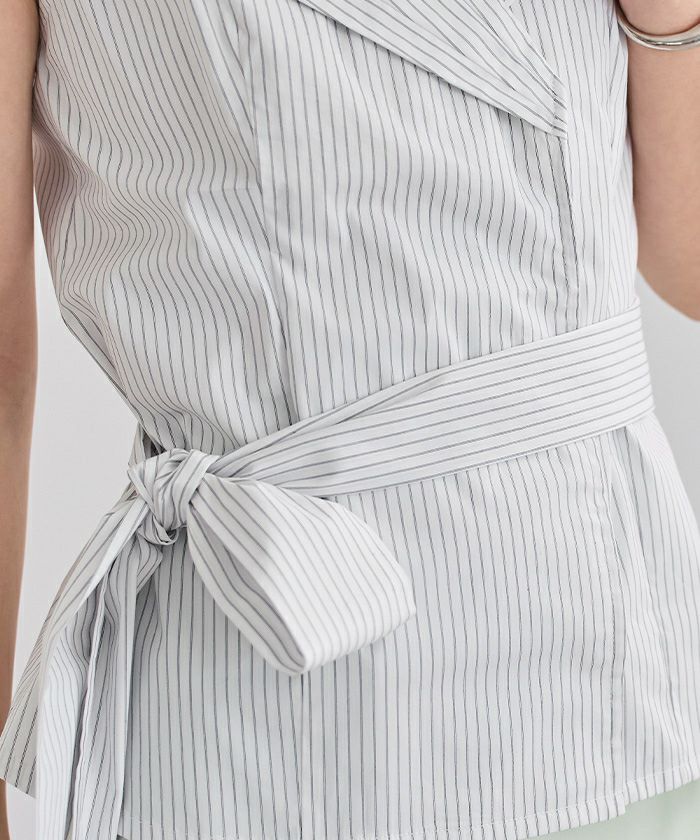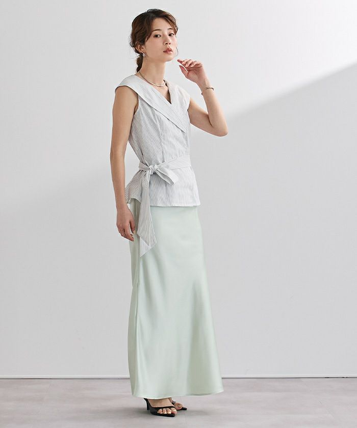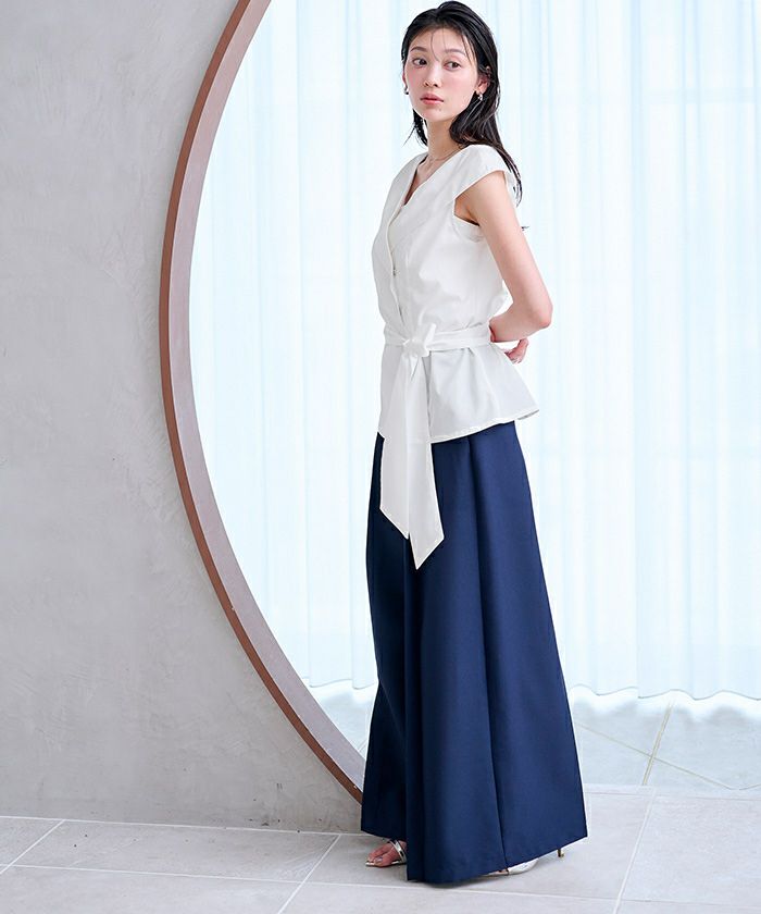 ウエストに共布リボンを結ぶことで、メリハリのある女性らしいシルエットを演出。