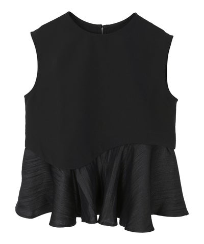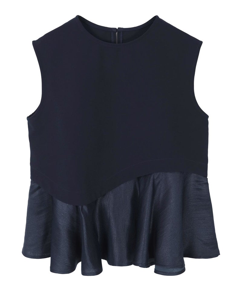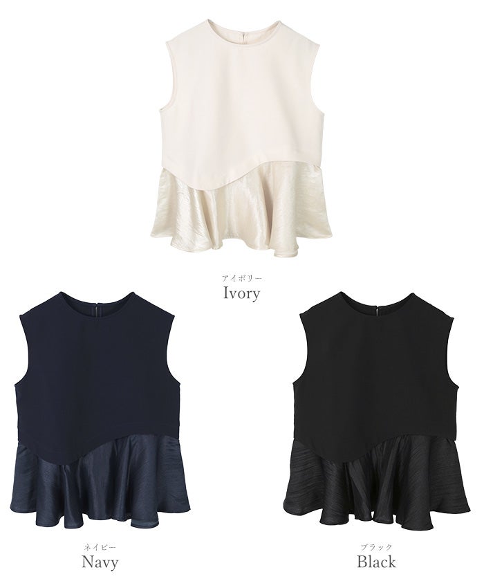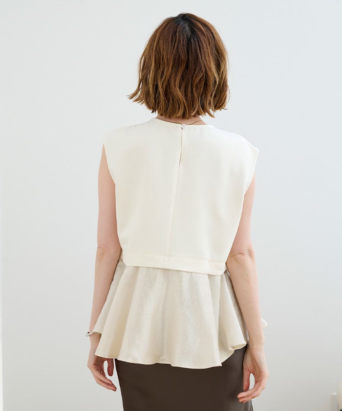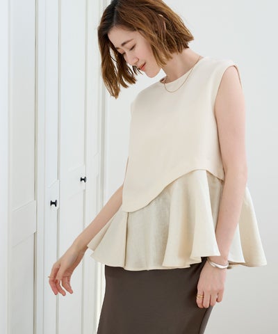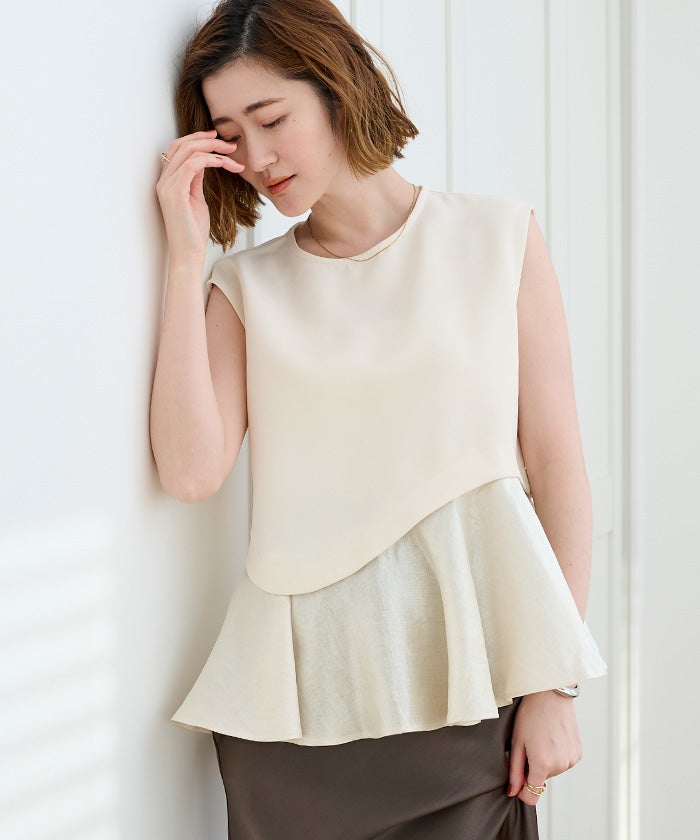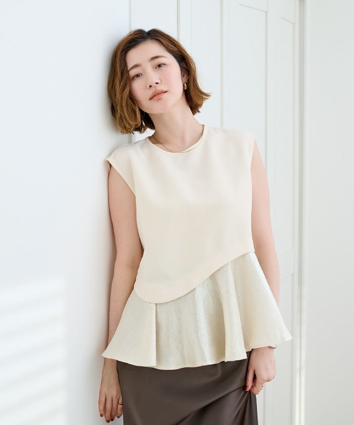 バストからウエストはすっきりしつつ、裾にかけて広がるペプラムシルエットのコントラストが、一枚で着映えするバランスに仕上げています。