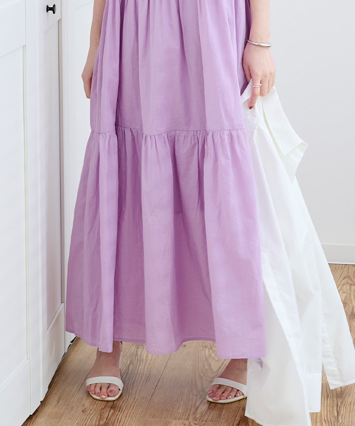 裾に向かって広がるティアードデザインが、軽やかで女性らしい印象に。