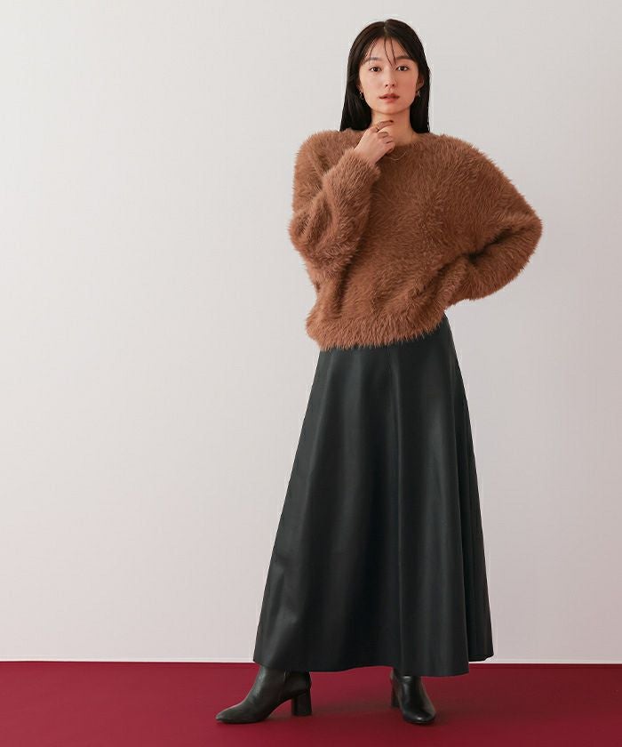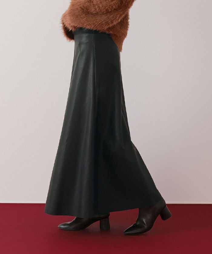 ・広がりすぎない程良いフレアが美しいシルエットを作り出すフェイクレザースカート。
