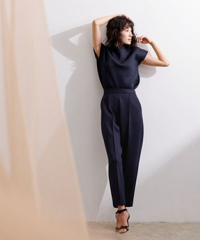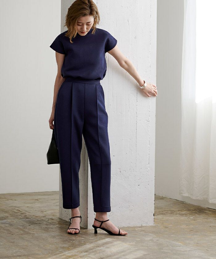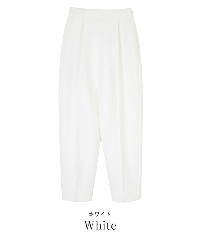 ヒップはゆったりとしていますが、センタープレスのおかげで美脚に見えて嬉しいです。ウエストがぴったりとしていて、トップスをインするときれいなシルエットで着用できました。私はウエストがちょうどいいLサイズを選びます。