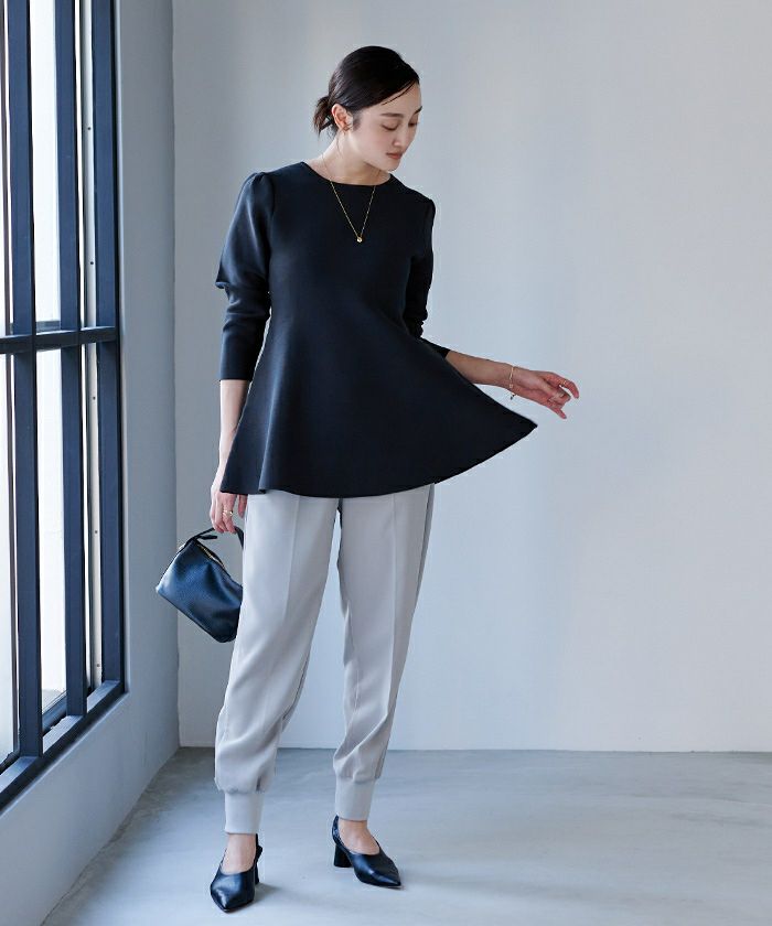 肩周りのぽわんとしたフォルムが大人可愛いパフスリーブペプラムニットトップス。