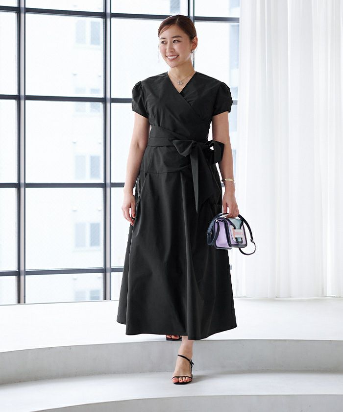 カシュクールデザインに後ろリボンで着用するとすっきりとした見え方に。