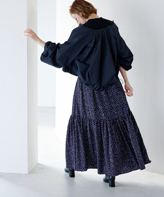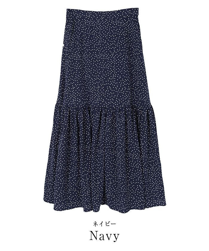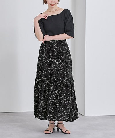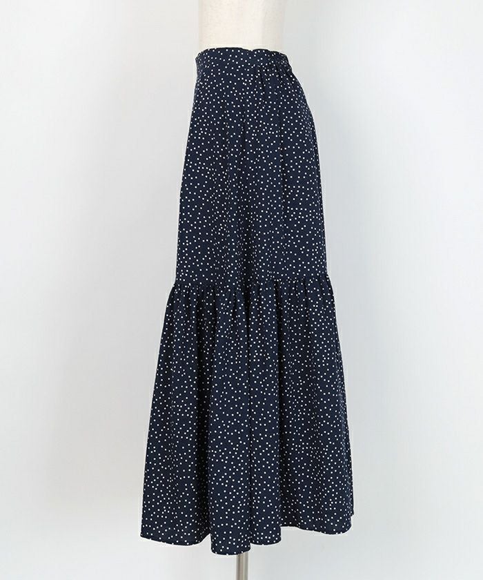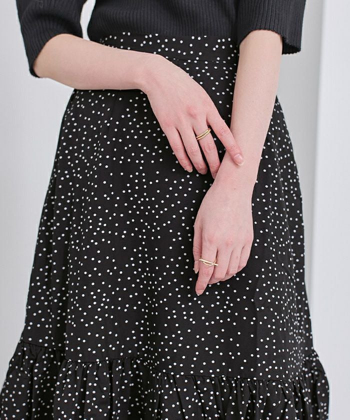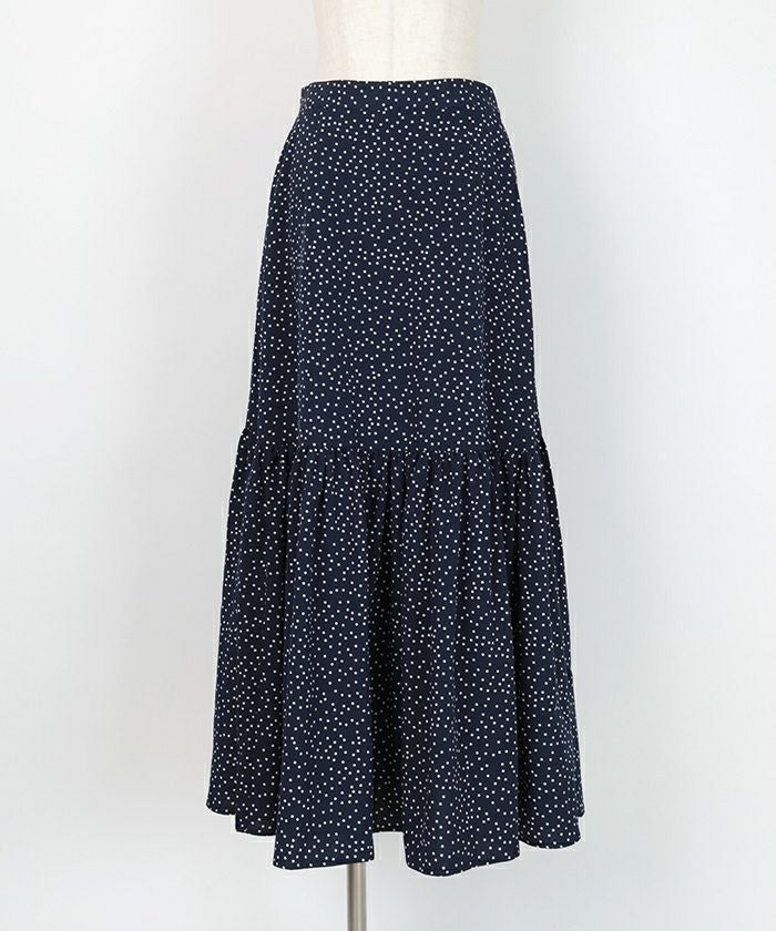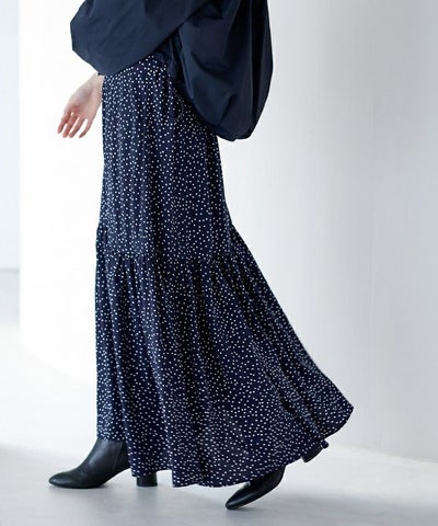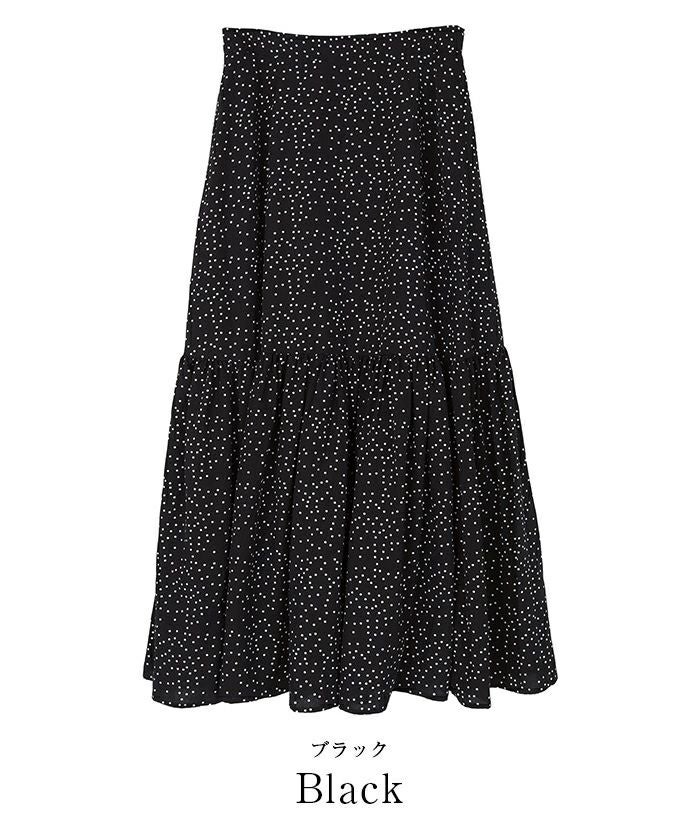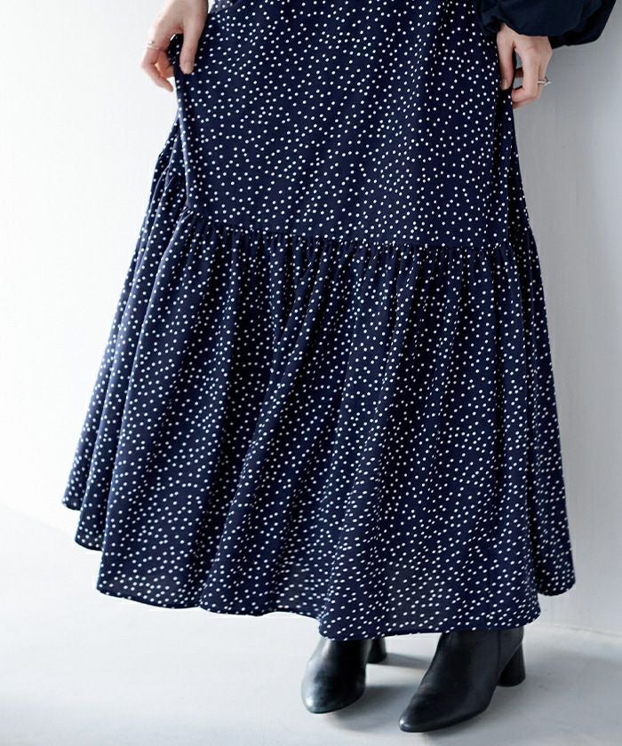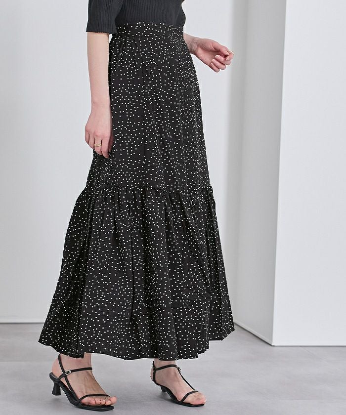 落ち感のあるドット柄プリント素材を使用したティアードスカート。