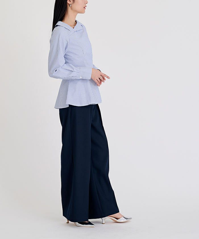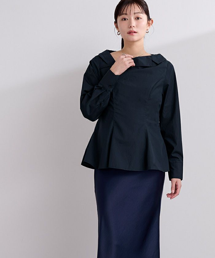 アシンメトリーに仕立てた衿元がデコルテを美しく見せて、女性らしい抜け感をプラス。