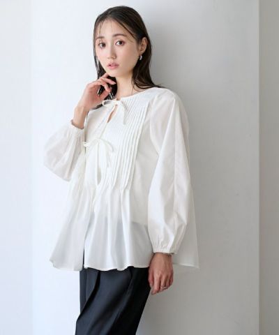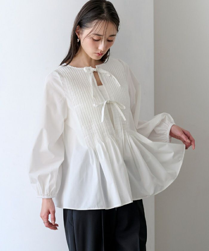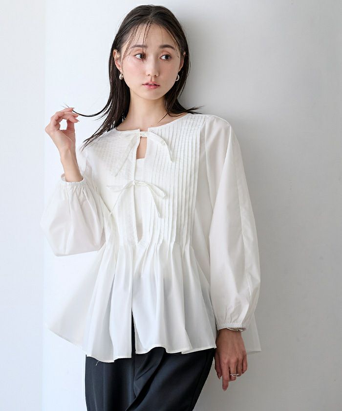 胸元に配したリボンディテールが品よく映えるブラウス。
