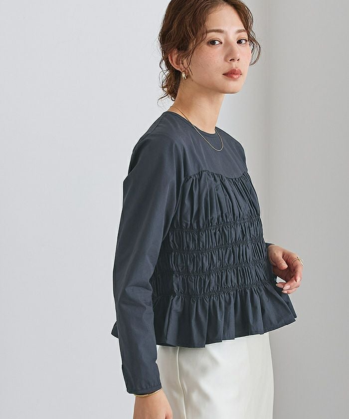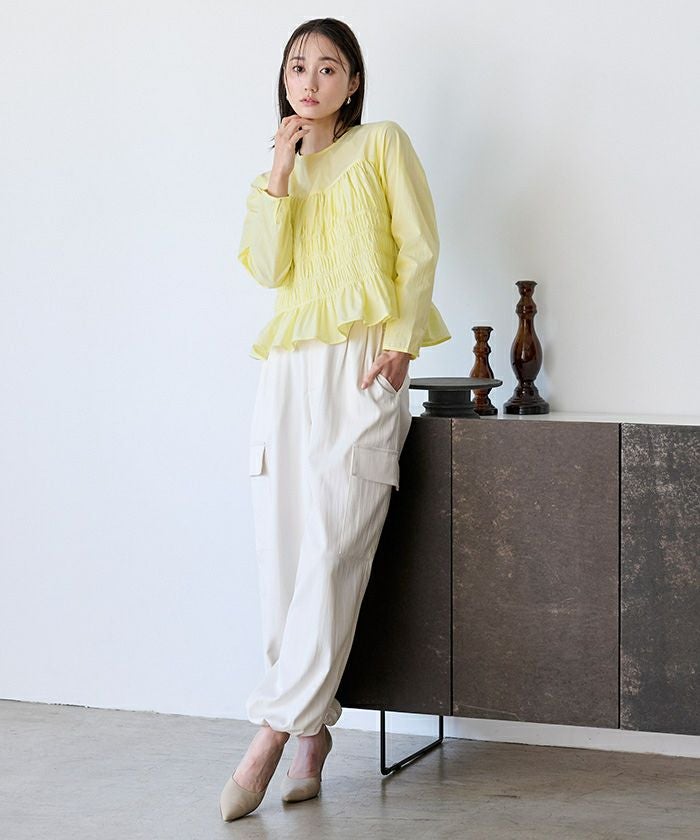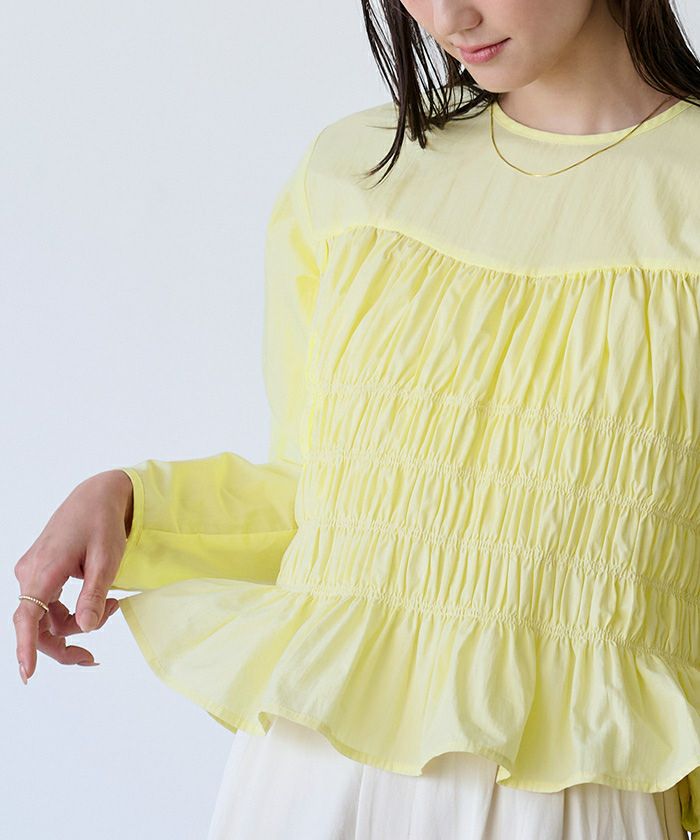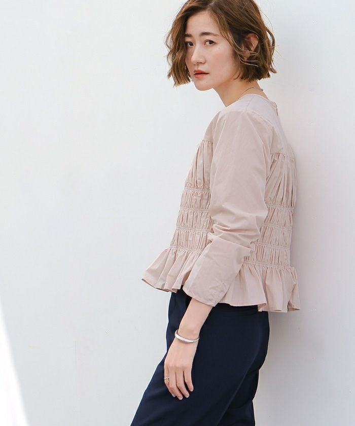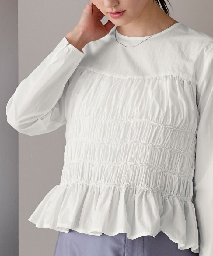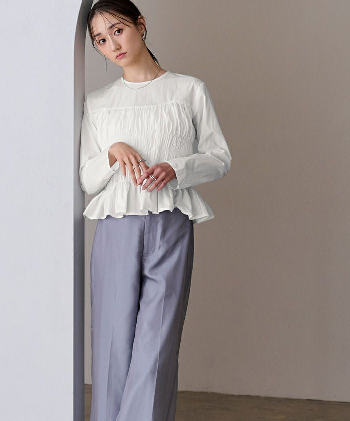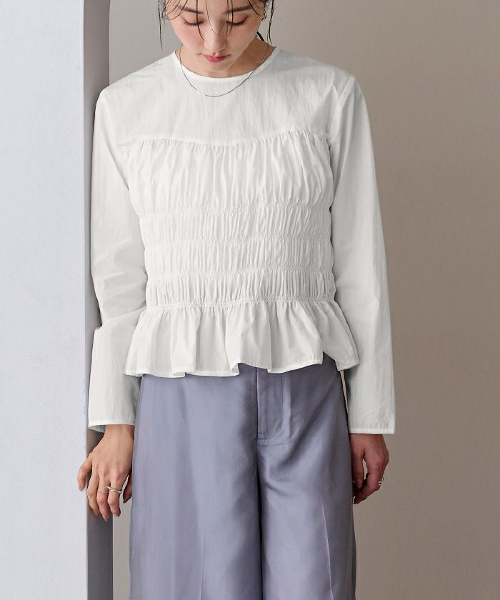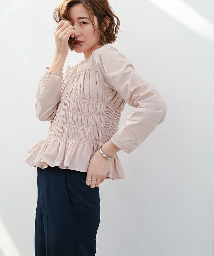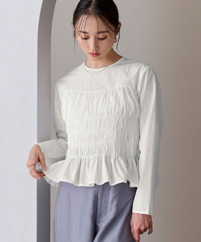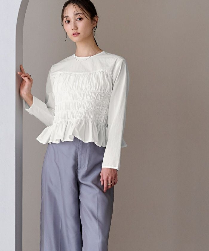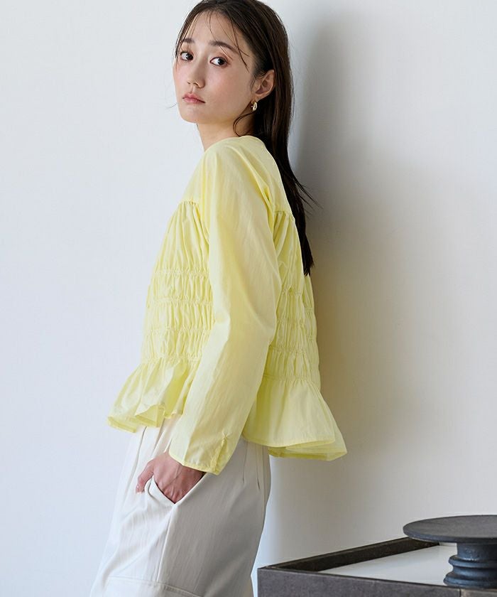 シャーリングがビスチェ風にデザインされた、トレンド感あふれるブラウス。