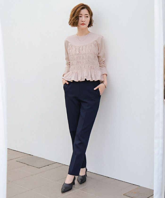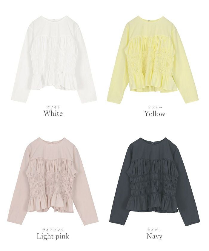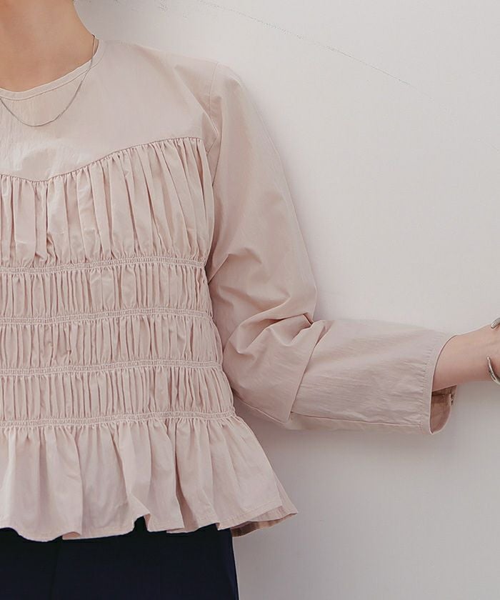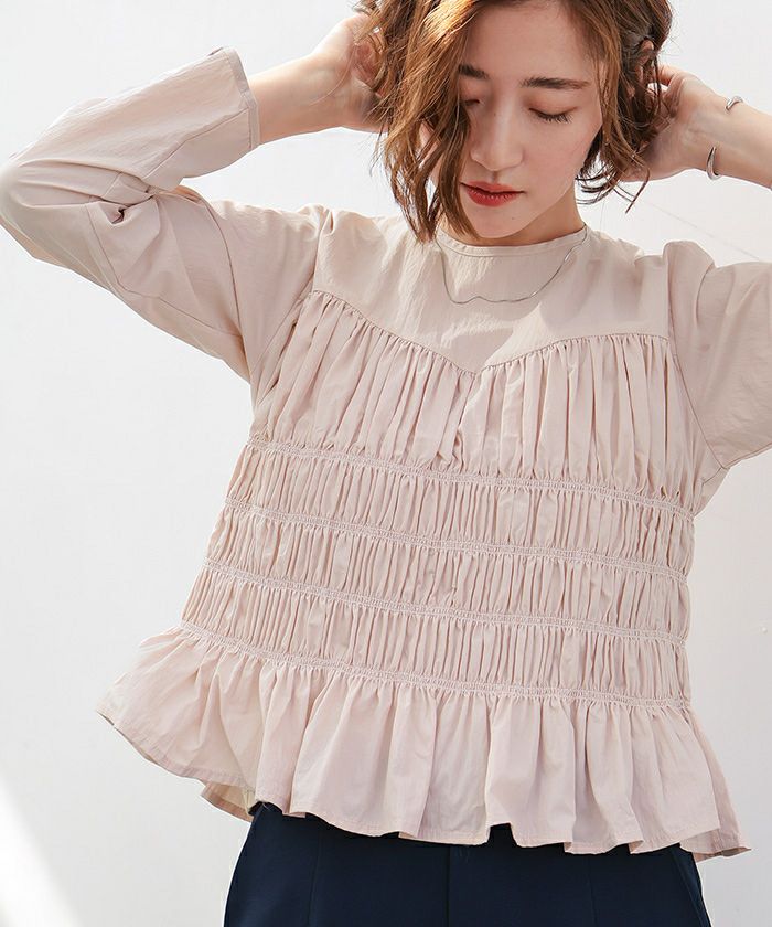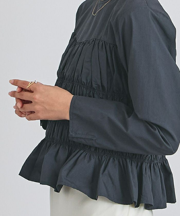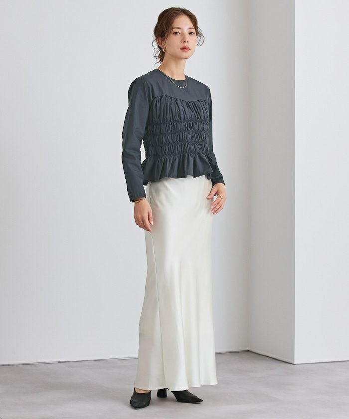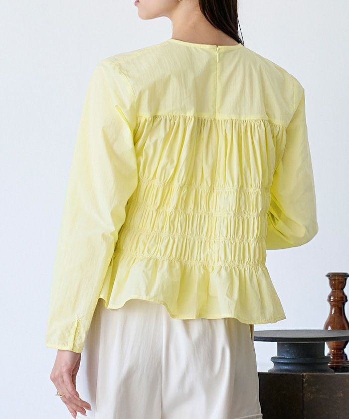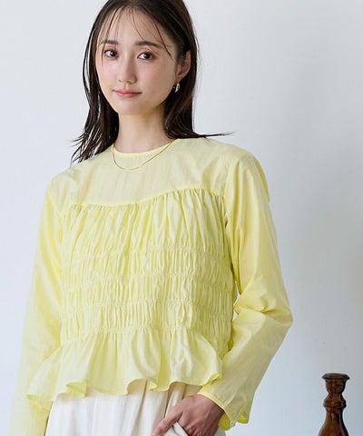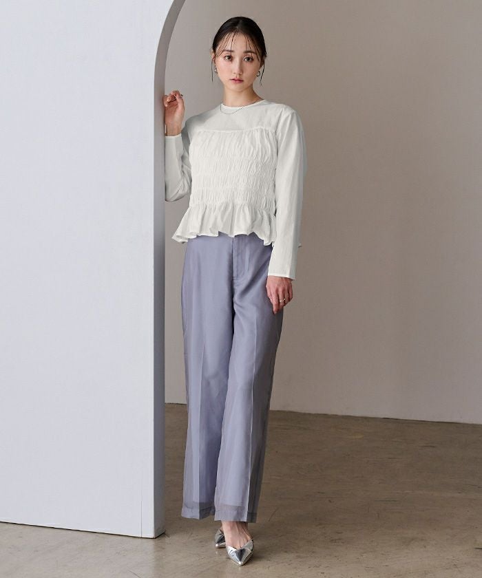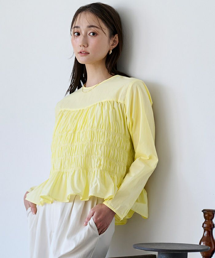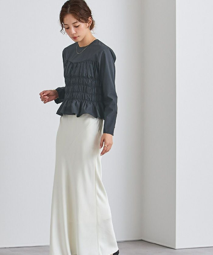 シャーリングがビスチェ風にデザインされた、トレンド感あふれるブラウス。