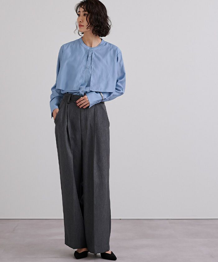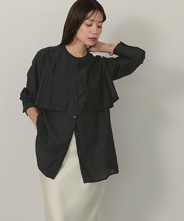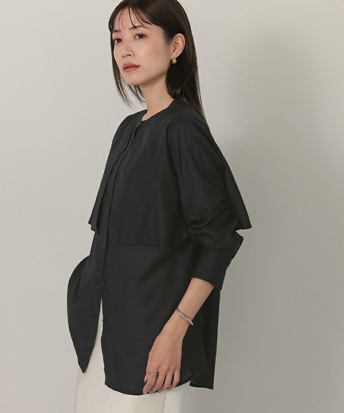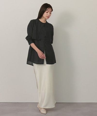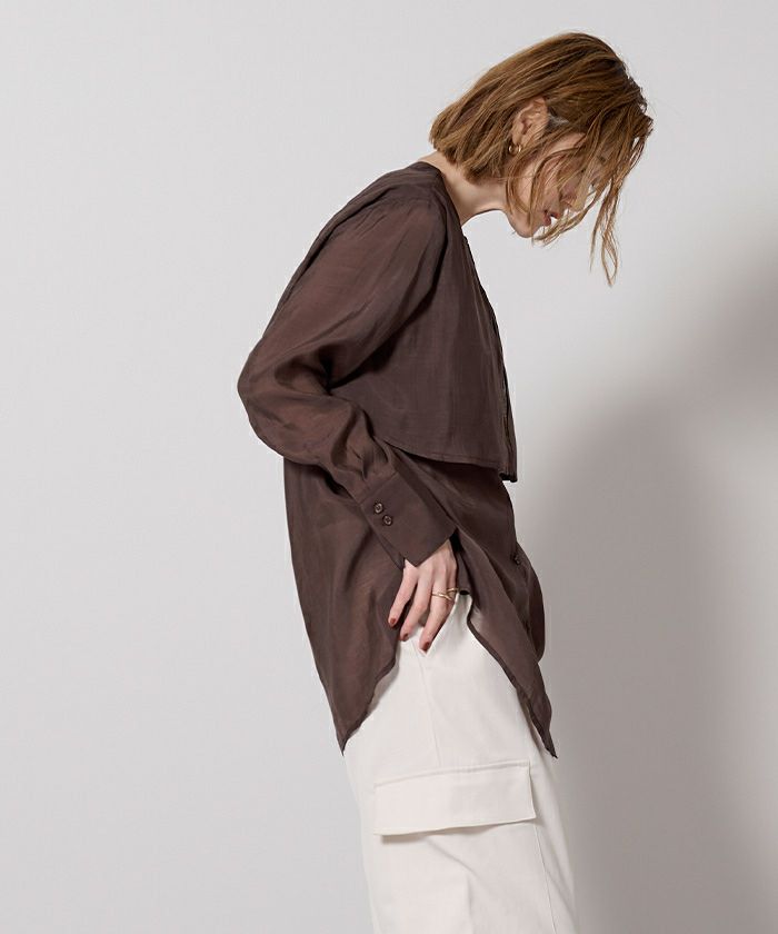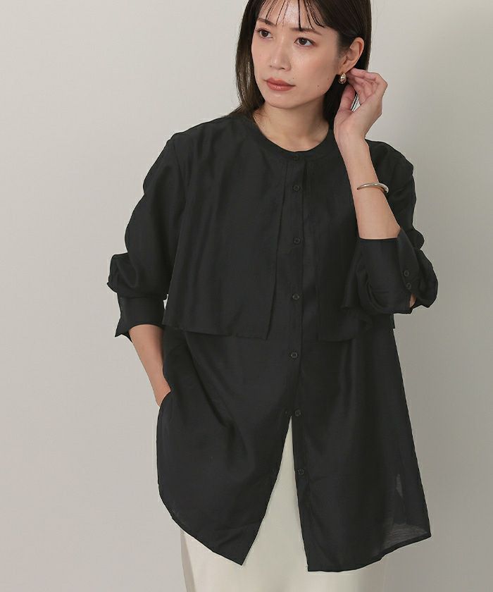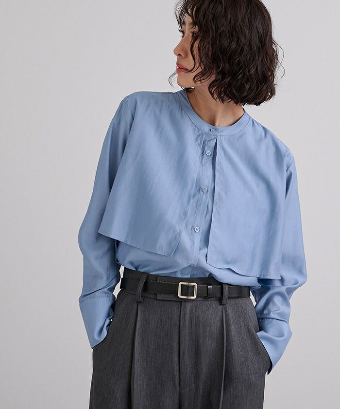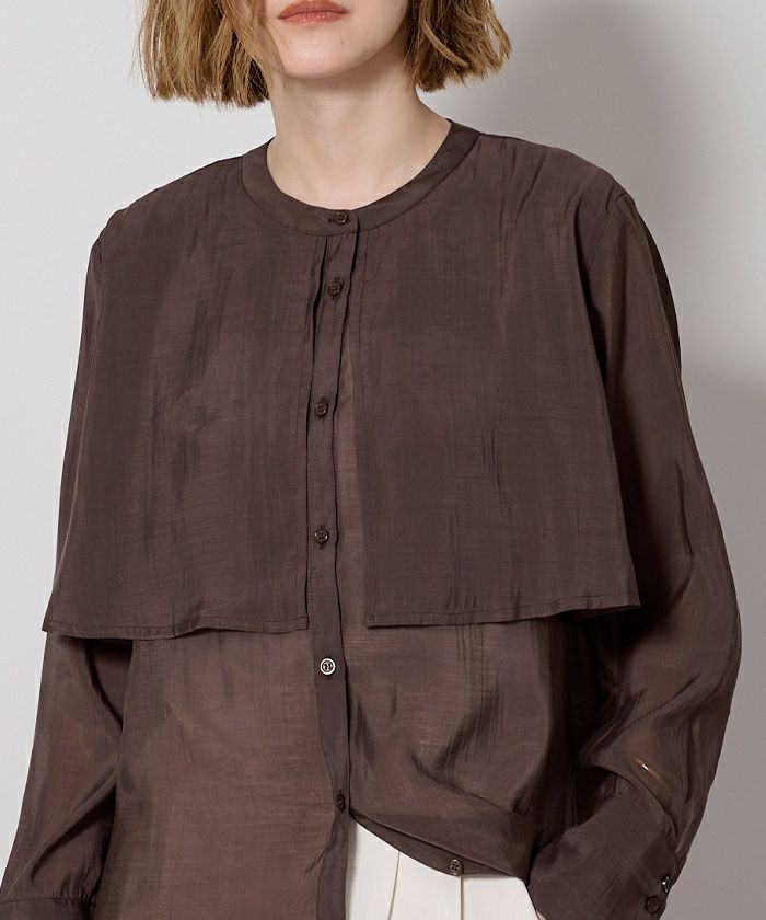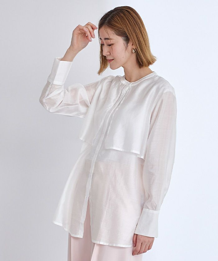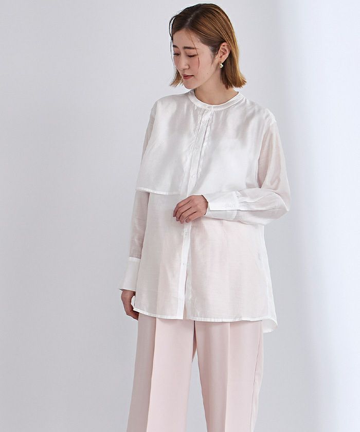 シアー感が女性らしいバンドカラーシャツ。