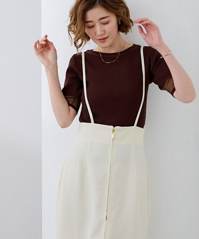 ゴールドのフロントジップがアクセントのサロペットスカート。