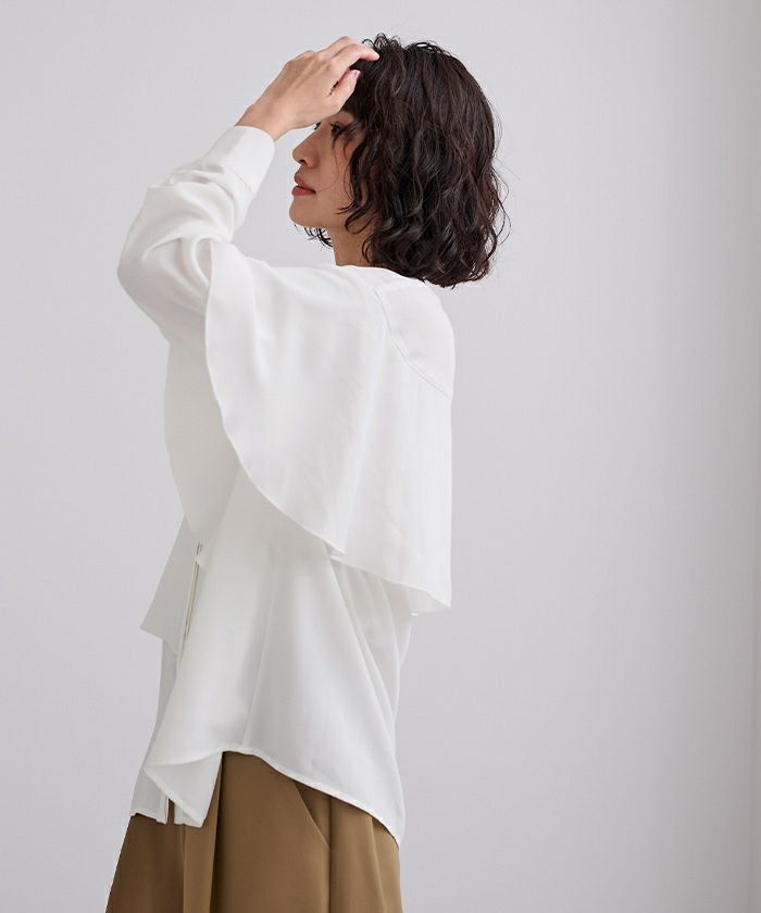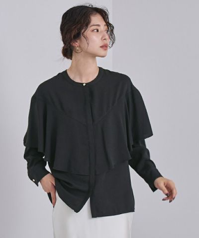 胸元のラッフルが大人可愛い印象を演出し、バンドカラーでハンサムな雰囲気をプラス。