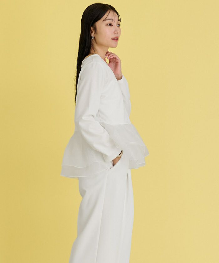 ペプラム部分には透け感のあるチュールを重ね、異素材の組み合わせで女性らしいふんわりとしたシルエットに仕上げています。