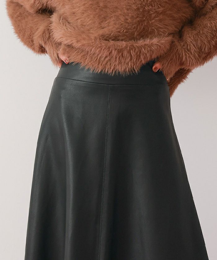・広がりすぎない程良いフレアが美しいシルエットを作り出すフェイクレザースカート。