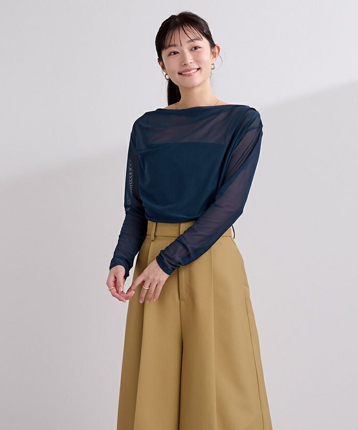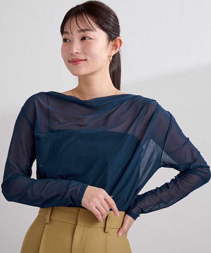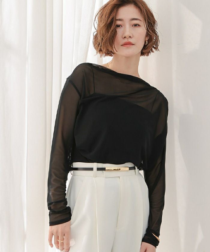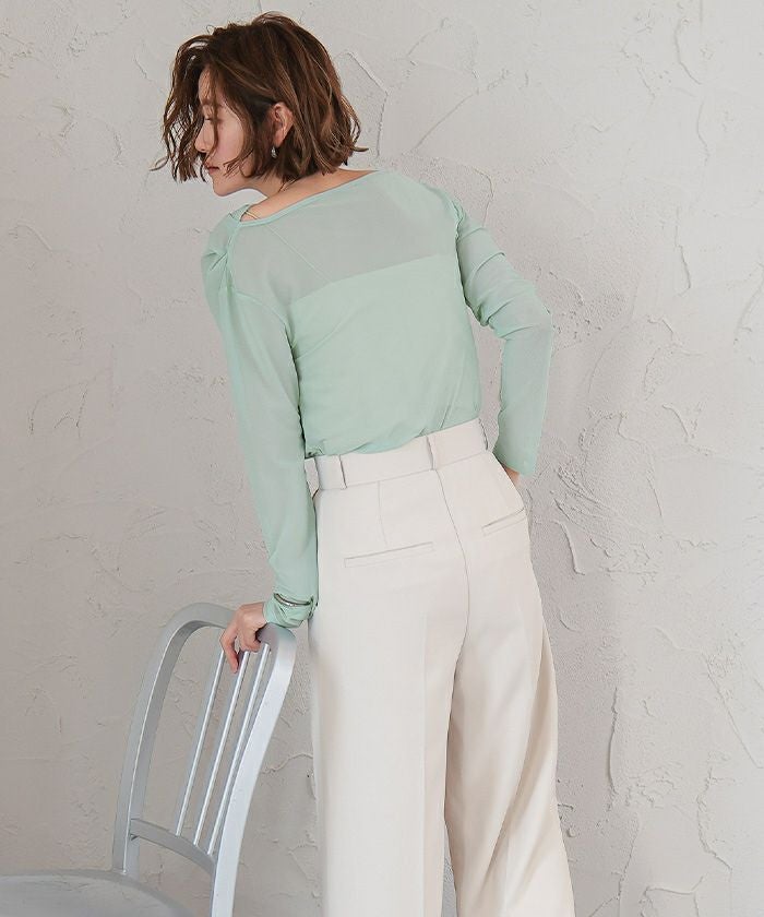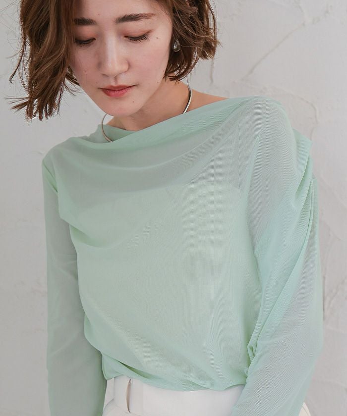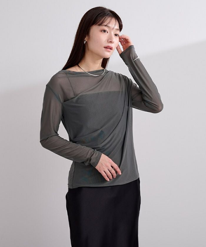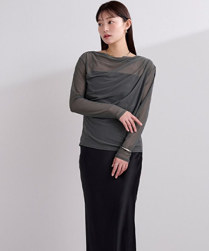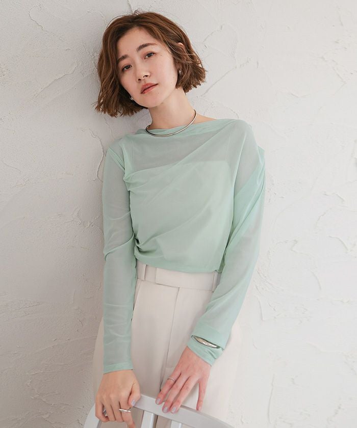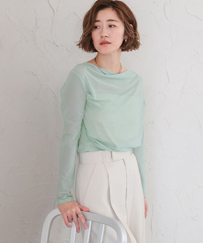 シアー素材を使用した抜け感のあるドレープカットソー。