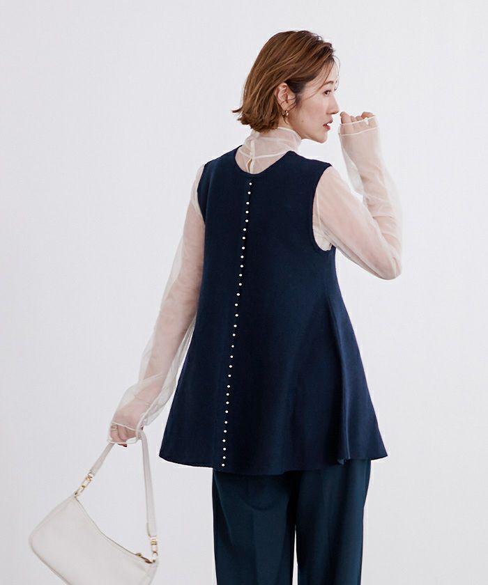 妊娠中に購入。産後も体型隠しに便利です。 インナーをシースルーのものに変えたり、タートルネックにかえたりしながら夏場以外は着用でき便利でした。 パールが外れるようなこともなく綺麗に着られています。