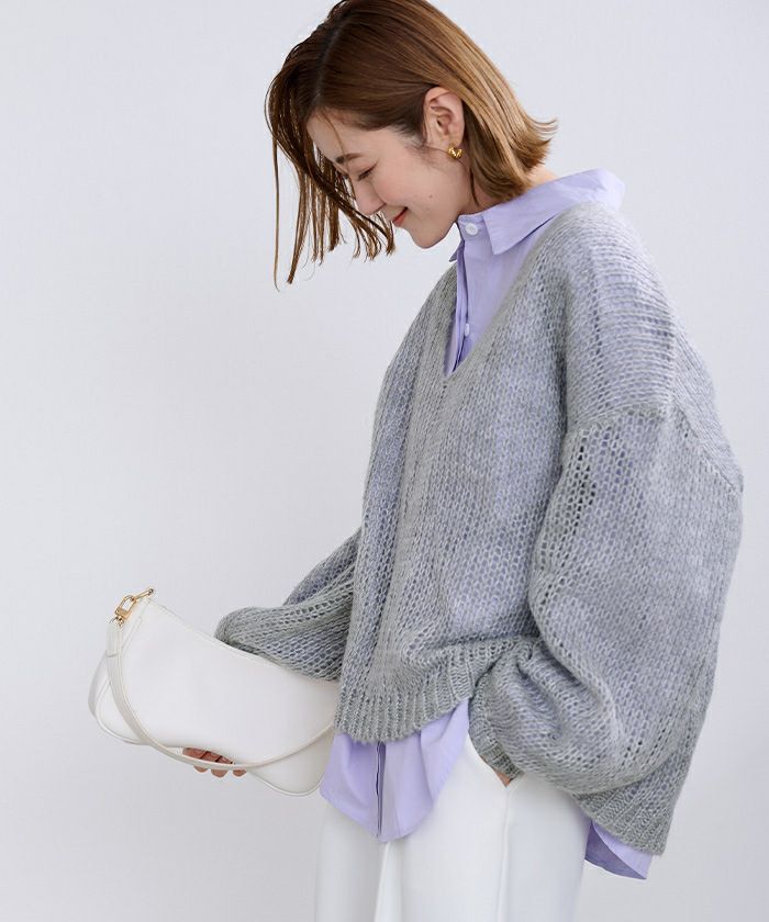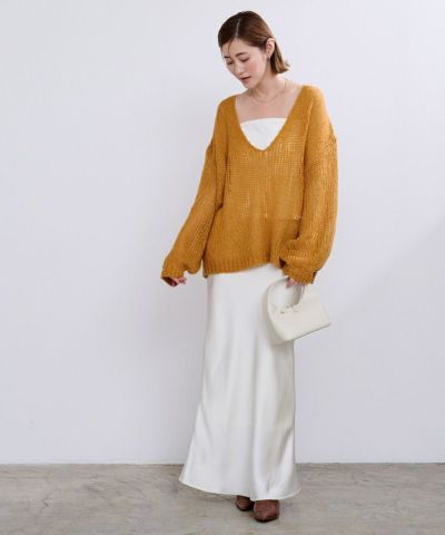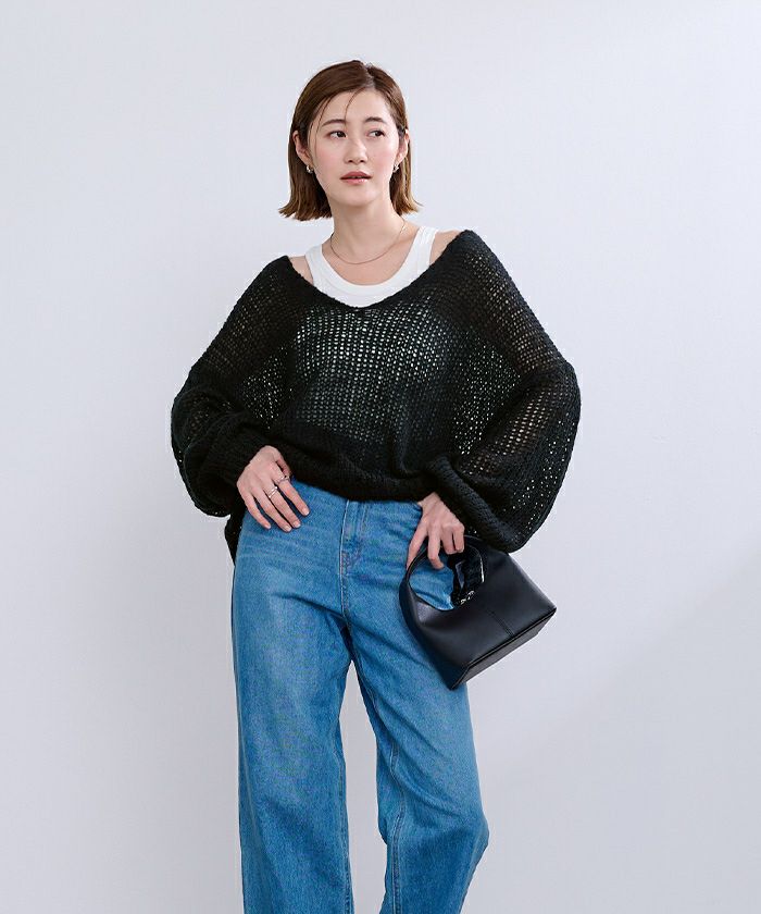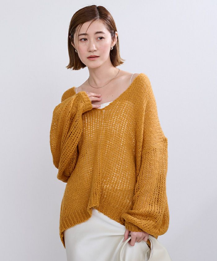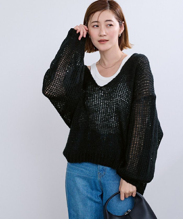 女性らしさを演出する透かし編みVネックニットトップス。