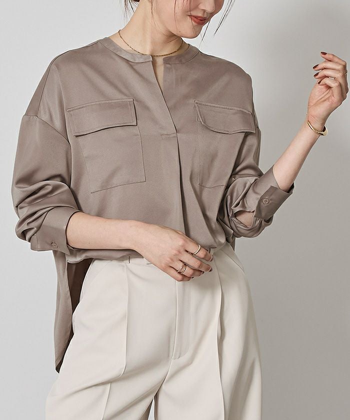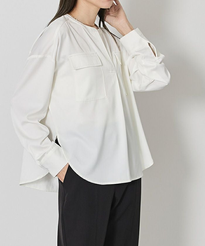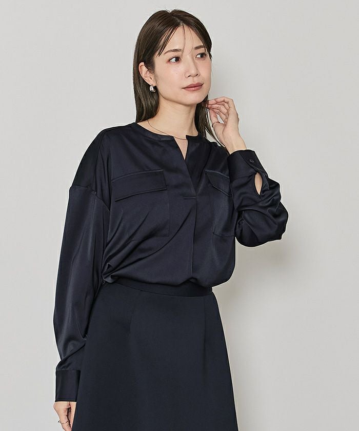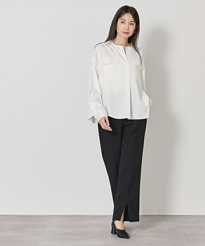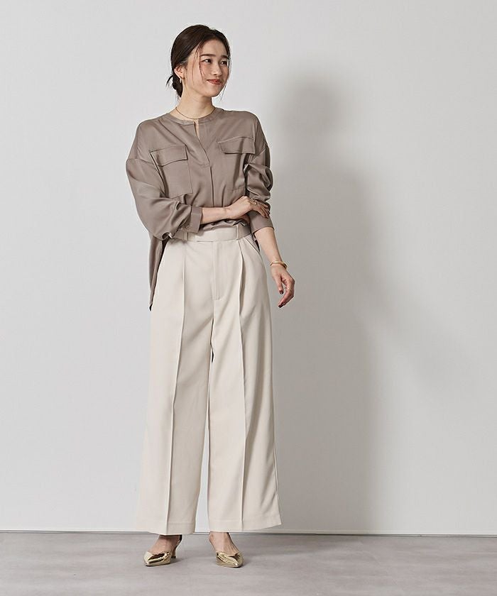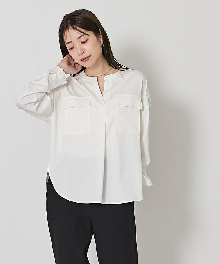 スキッパーネックがデコルテを美しく見せ、抜け感を演出するブラウス。