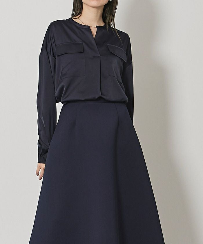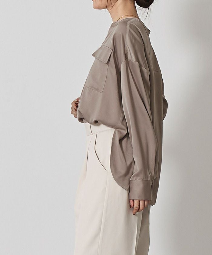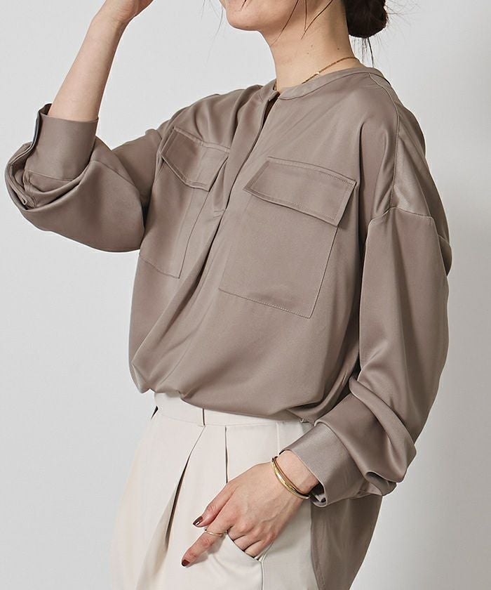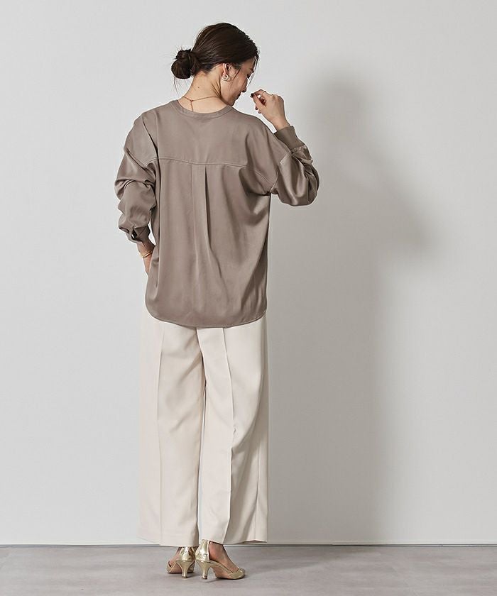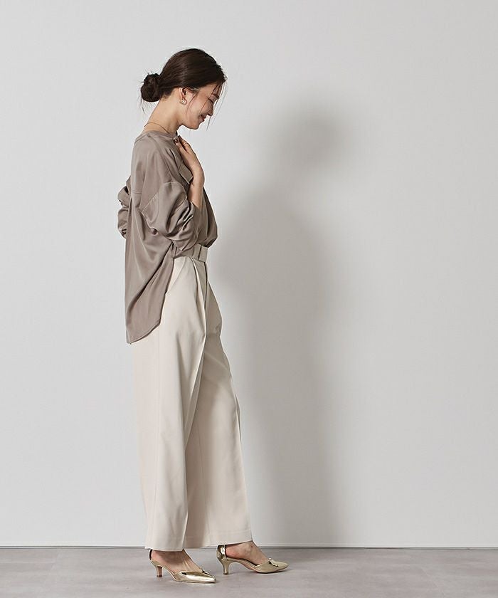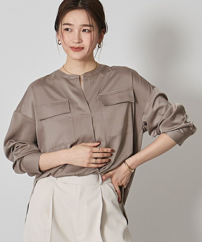 スキッパーネックがデコルテを美しく見せ、抜け感を演出するブラウス。