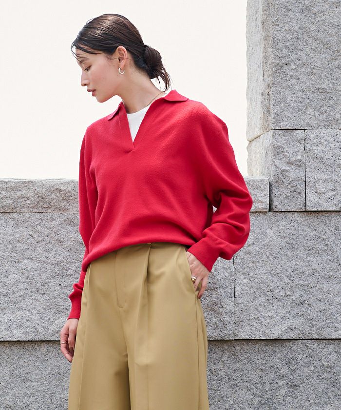 襟付きなので、きちんと感もプラスされ、カジュアルにもキレイめにも対応できる一枚です。