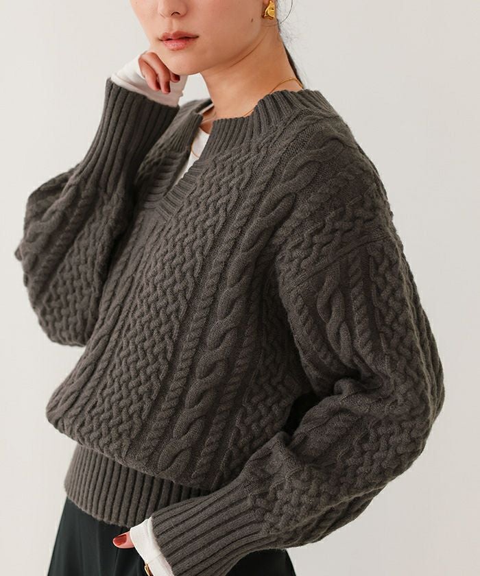 ケーブル編みの立体感と温かみのある素材で、1枚でおしゃれが決まるニットです。