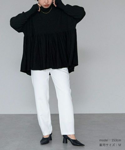 首元でクシュッとさせて抜け感出せる長めのハイネック。