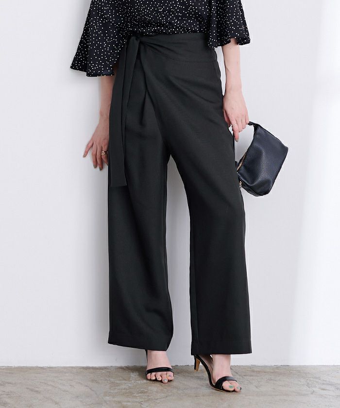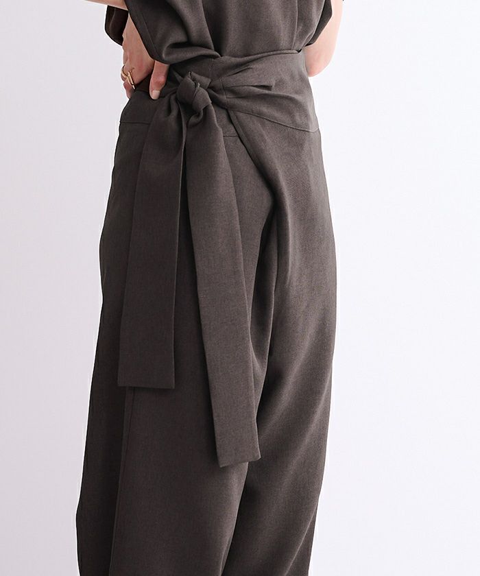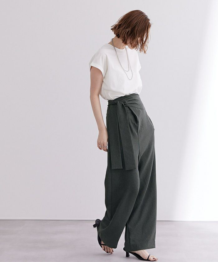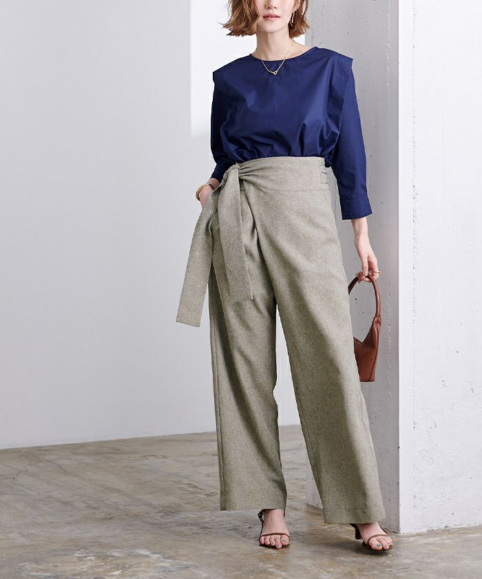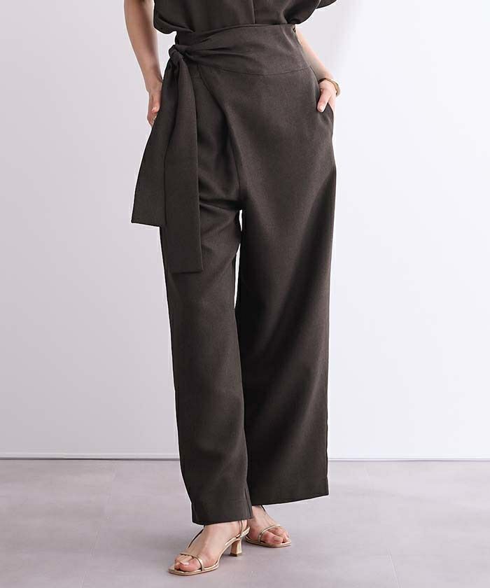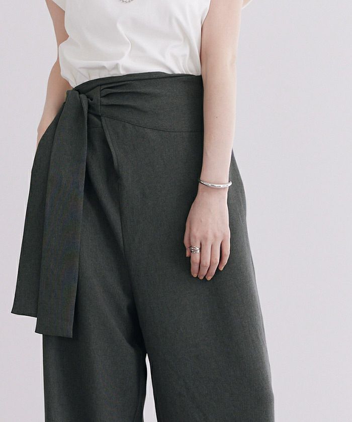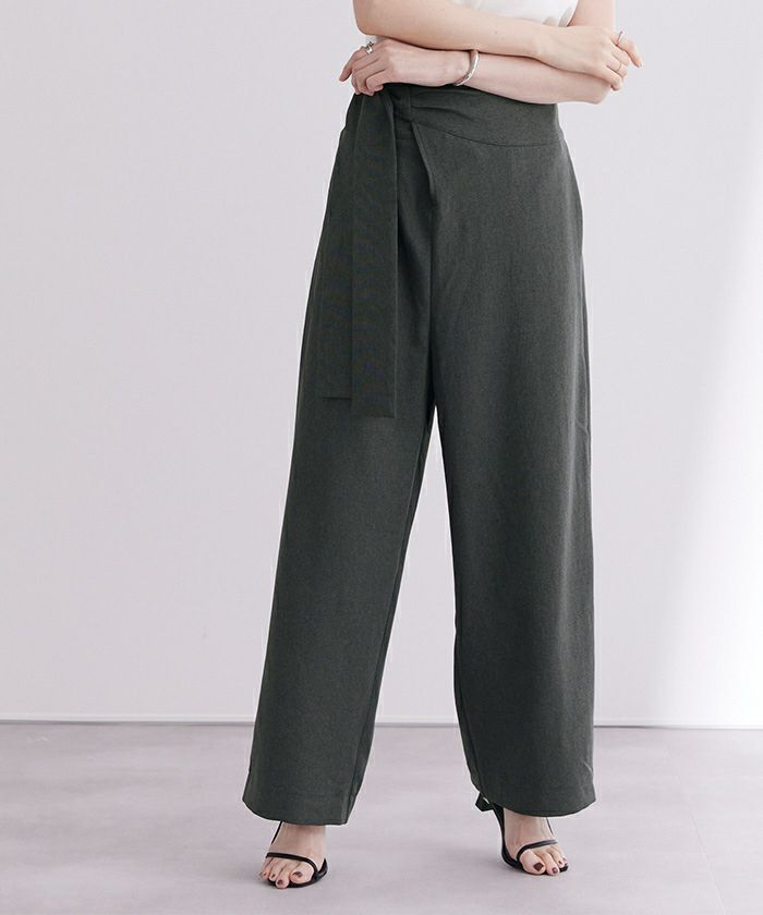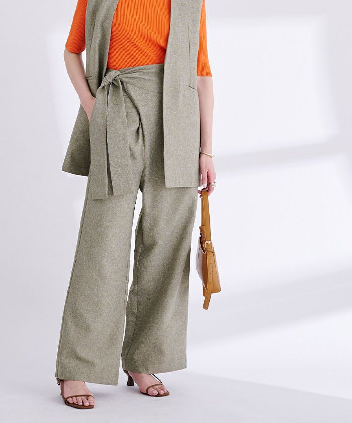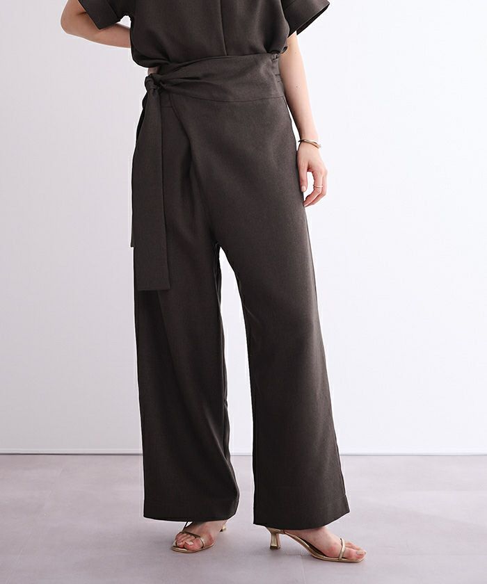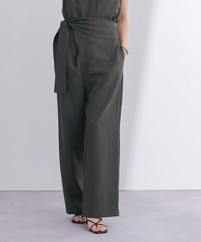 リネンライク素材のワイドパンツにラップ風デザインでアクセントを加えた一枚。