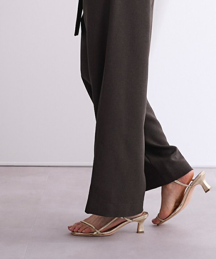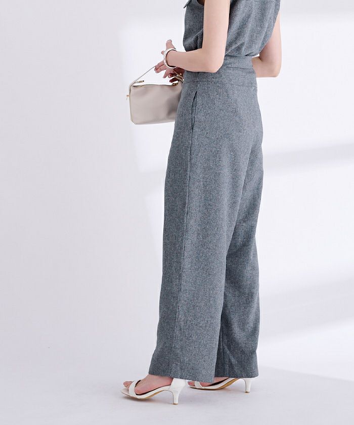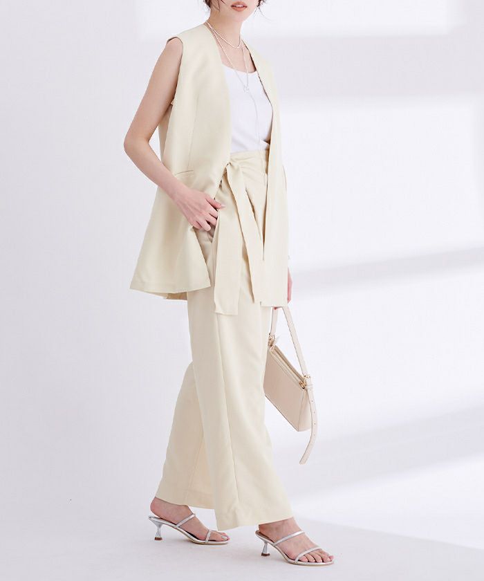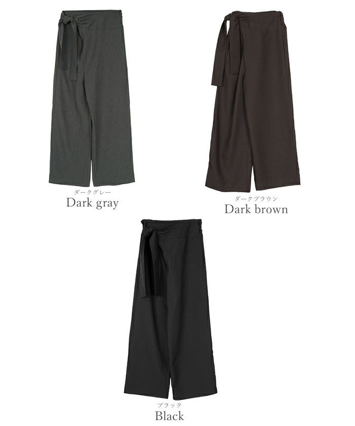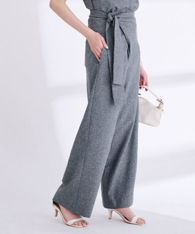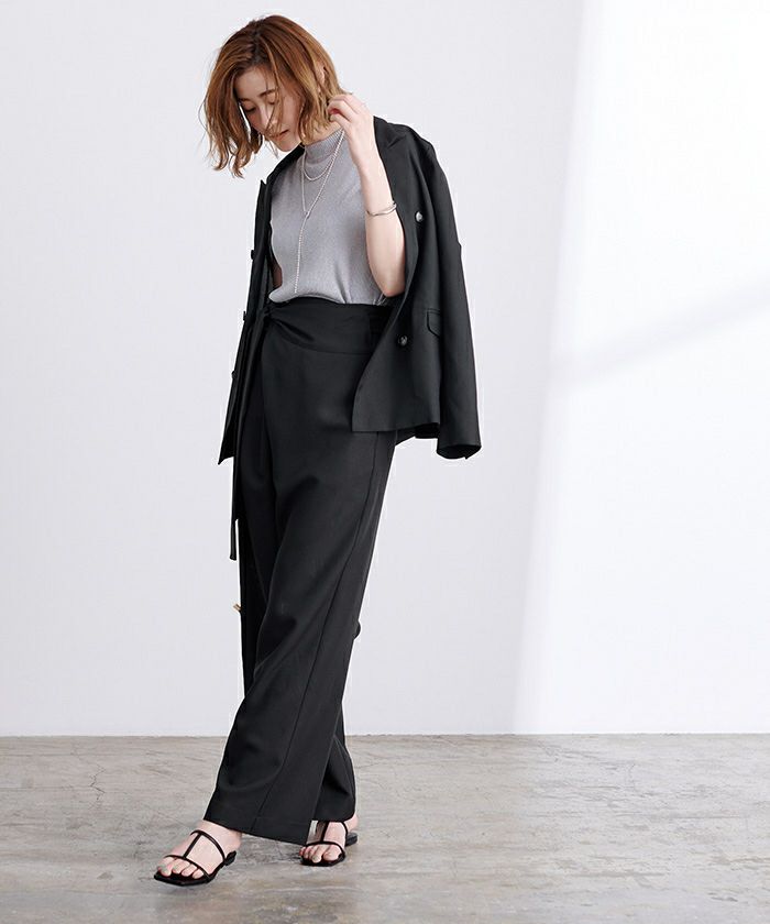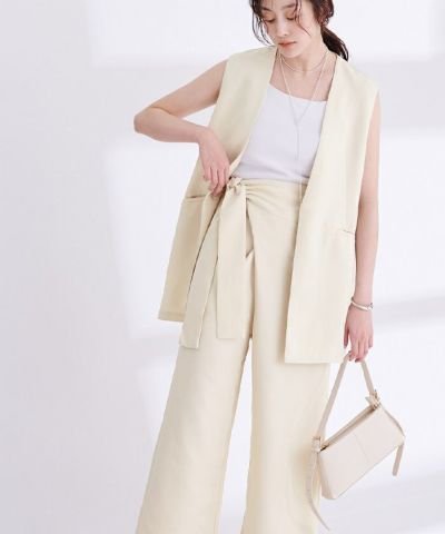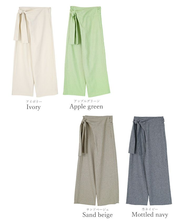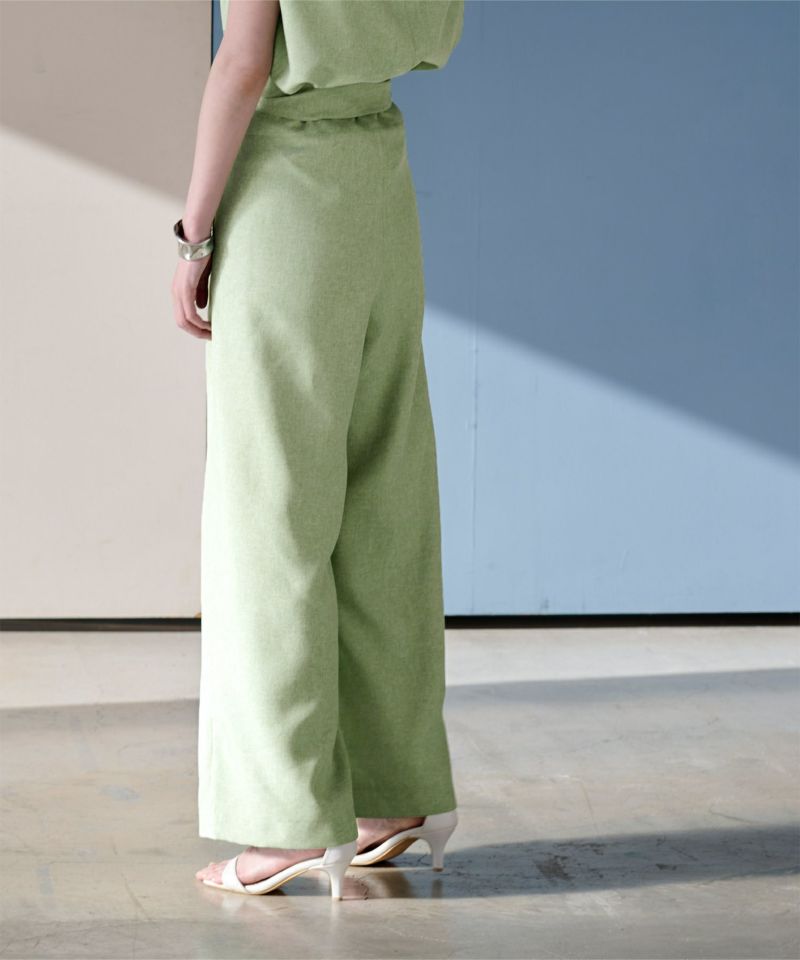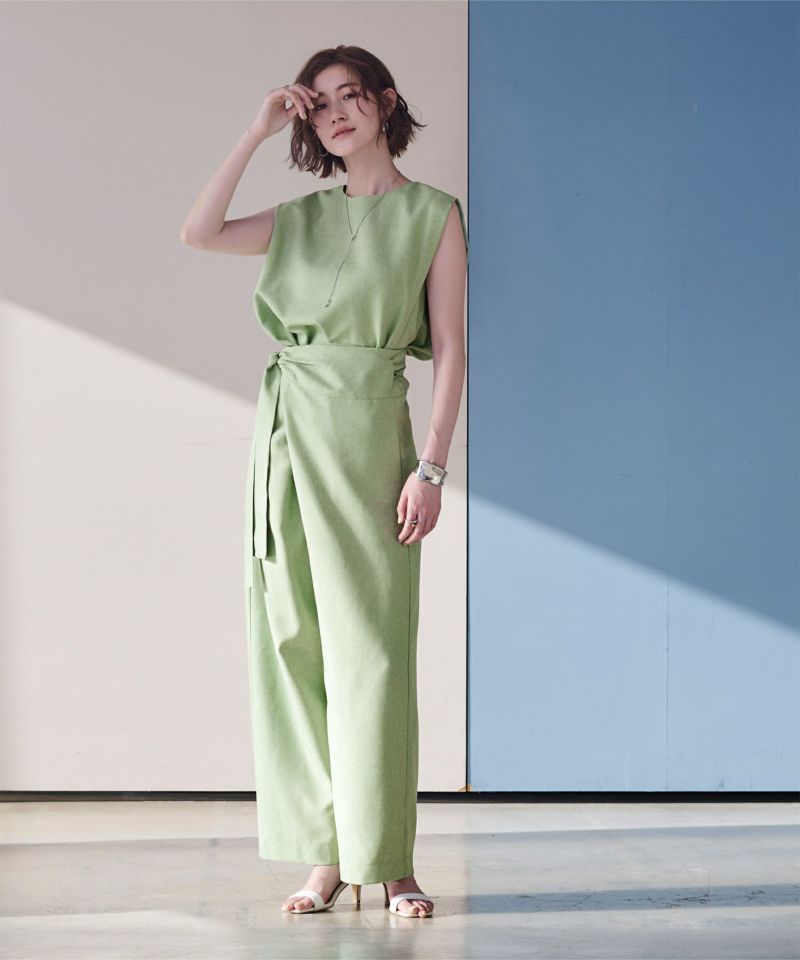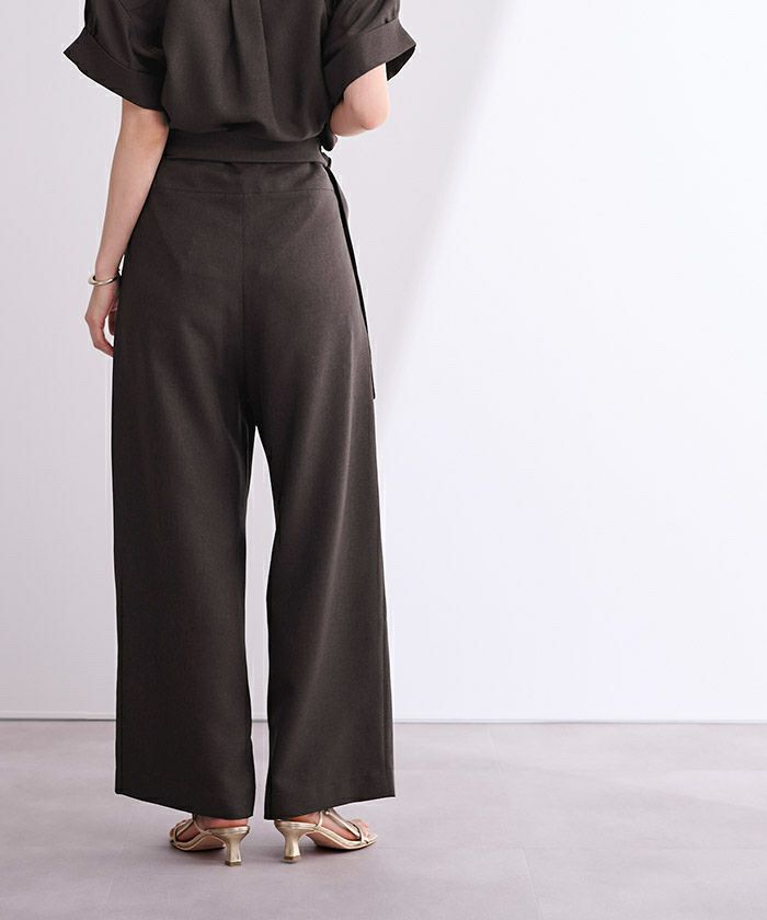 リネンライク素材のワイドパンツにラップ風デザインでアクセントを加えた一枚。
