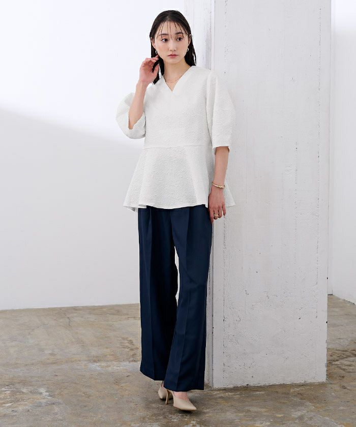 ウエストから裾にかけて広がるペプラムデザインで、女性らしい印象を与えます。