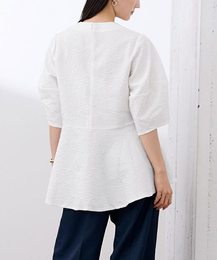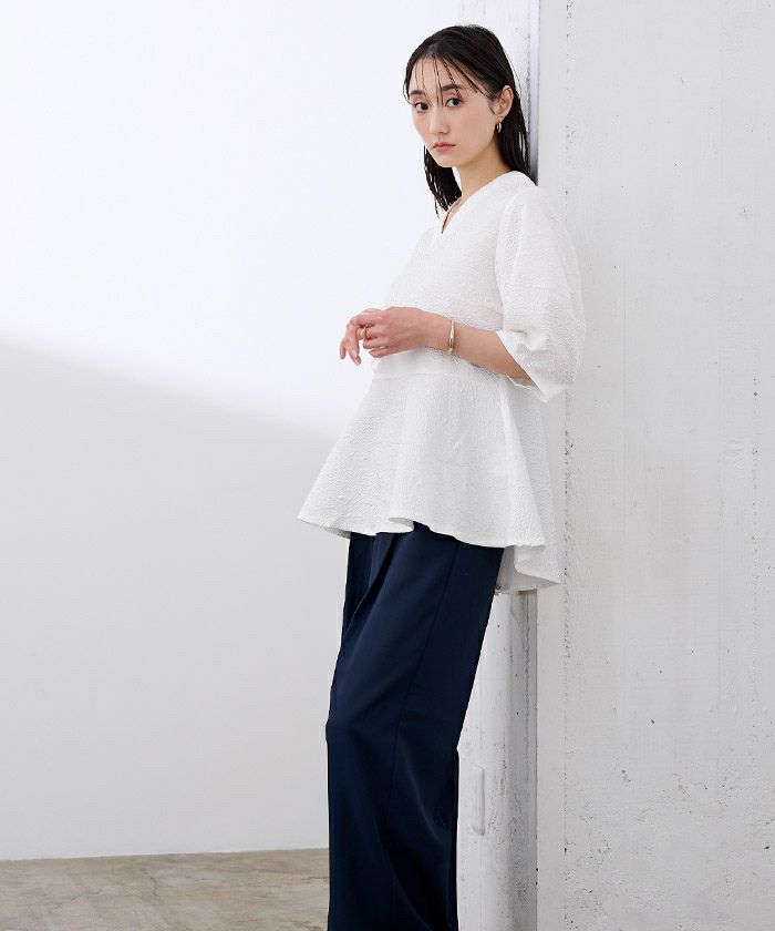 表面変化を楽しめるふくれジャガード生地を使用したVネックトップス。