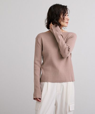 ボートネックでデコルテを綺麗に見せられるシンプルなリブニット。