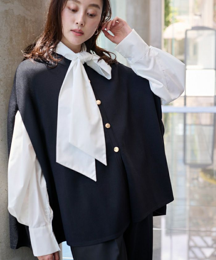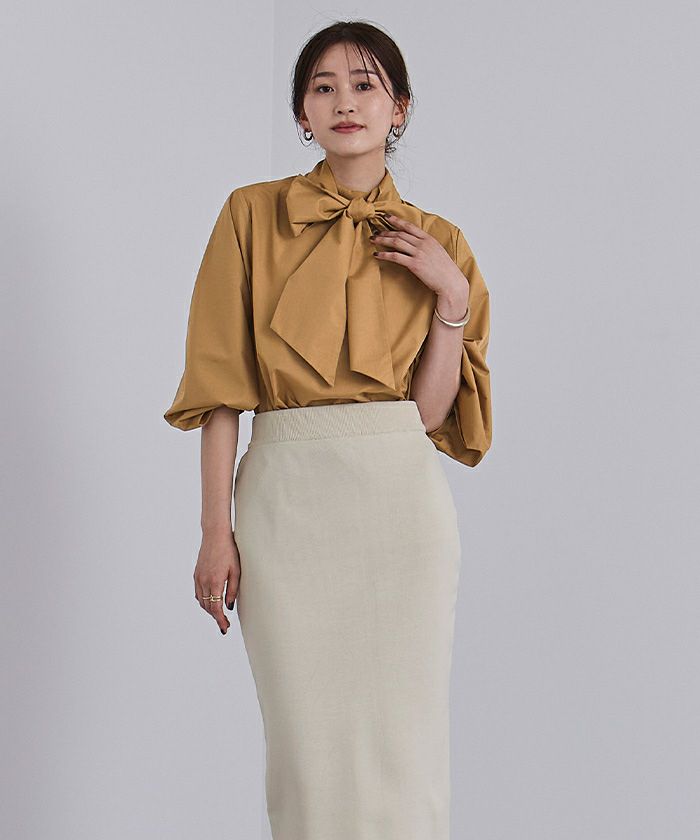 ブラウス自体がハイネックデザインになっており、ボウタイなしでもすっきりと着用いただけます。