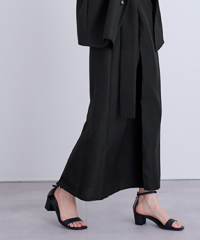 太めのウエストベルトとサイドバックルのディテールが腰位置を高く見せ、スタイルアップ効果が期待できるのもポイント。