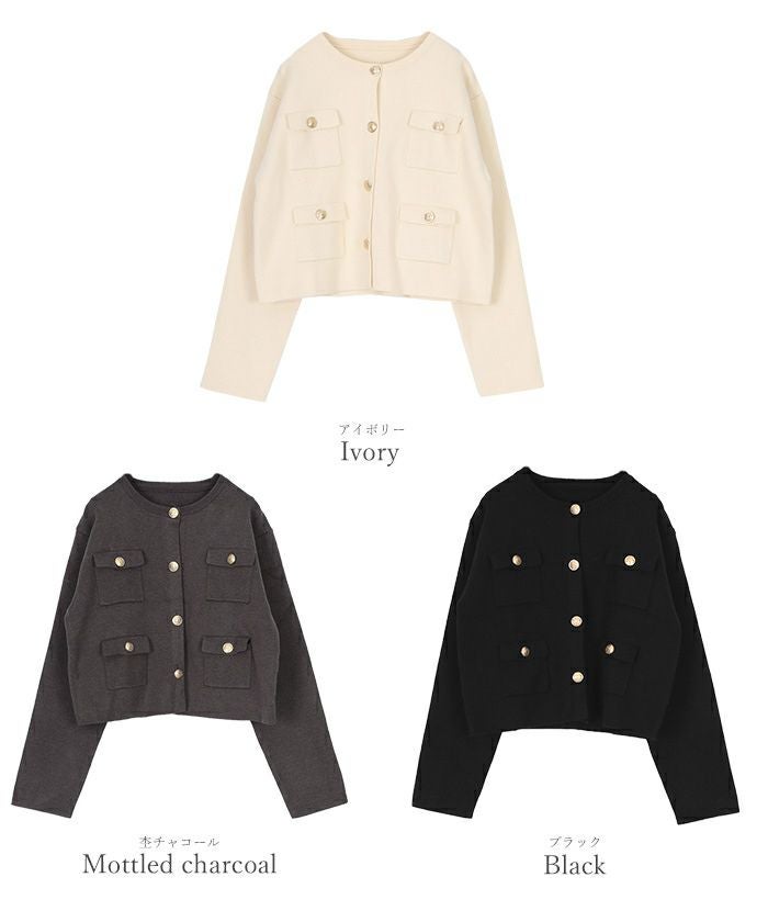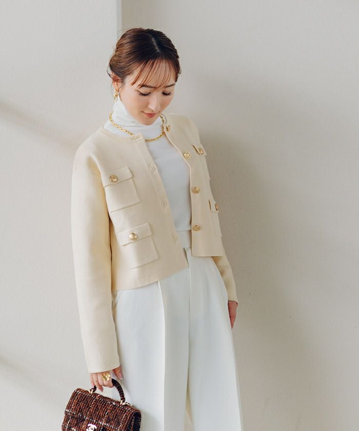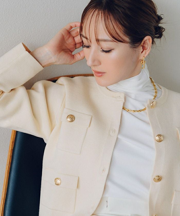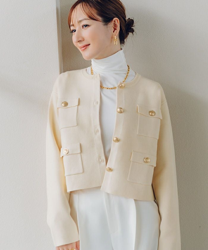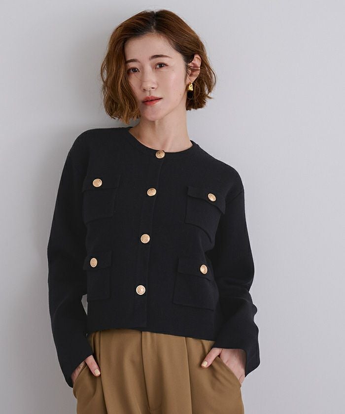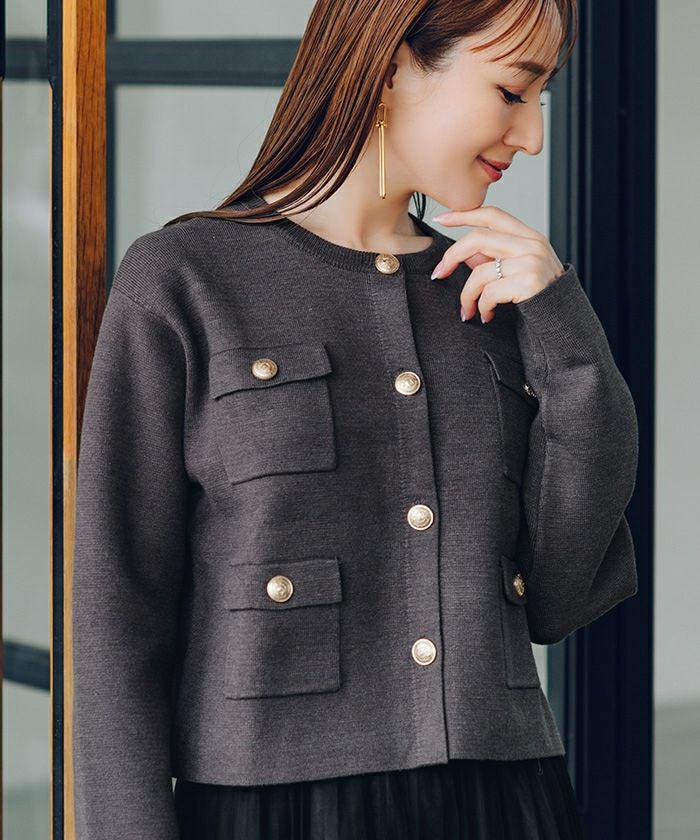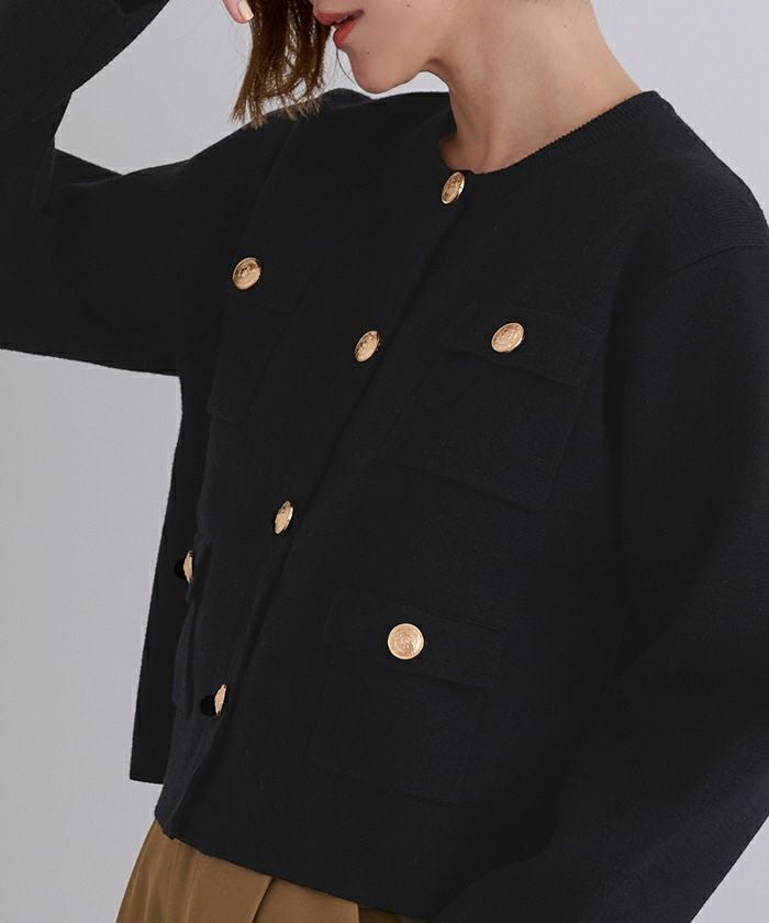 高級感のあるゴールド釦がアクセントのニットカーディガン/ジャケット。